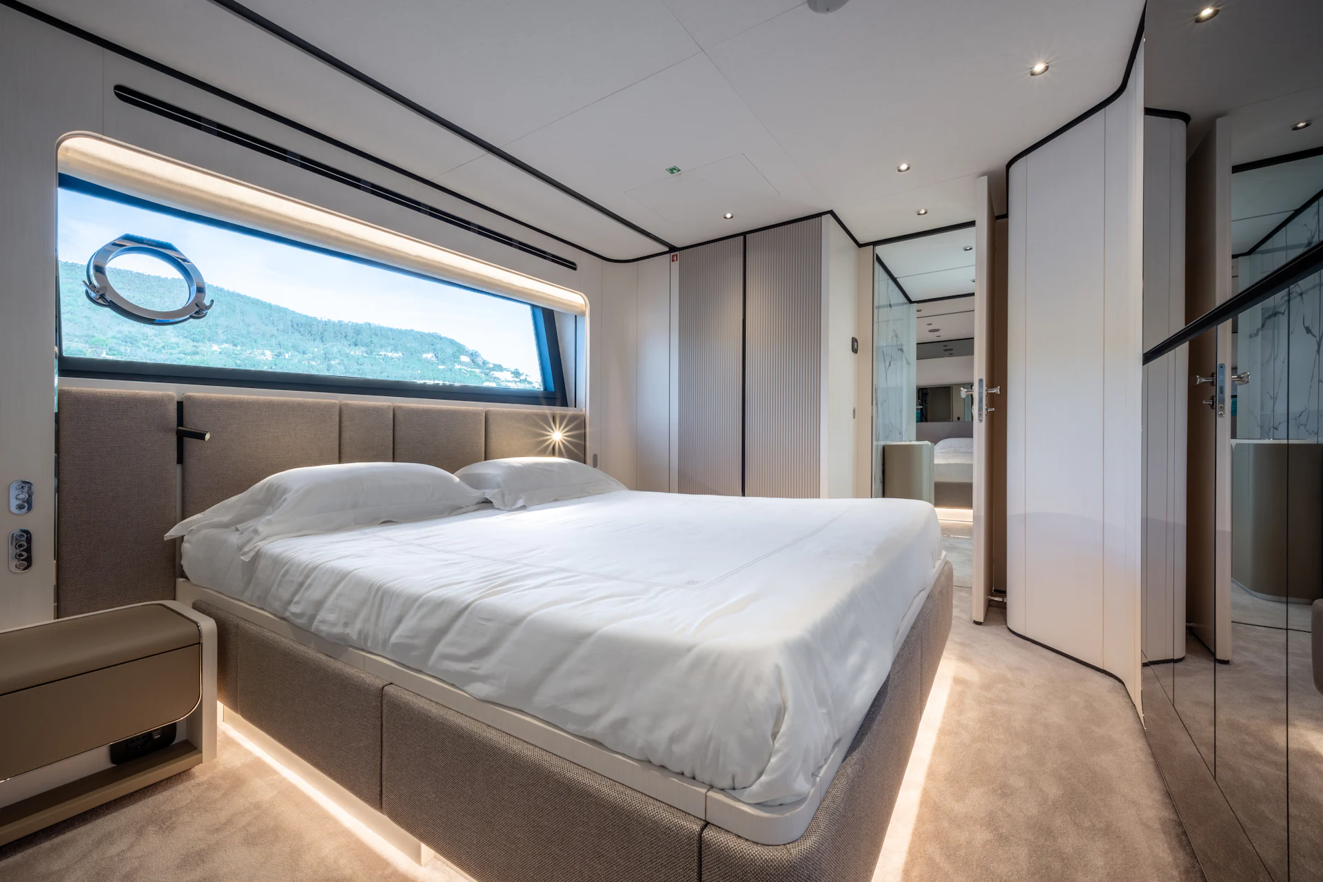 The Ferretti 940 measures approximately 28.97 metres (95 ft 1in) in overall length, with a maximum beam of around 6.76 metres (22 ft 2in). It offers a gross tonnage of approximately 120 GT and is built on a wide-body hull concept. The accommodation layout includes five cabins: a full-beam owner’s suite on the main deck and four guest cabins on the lower deck, offering space for up to ten guests plus crew.