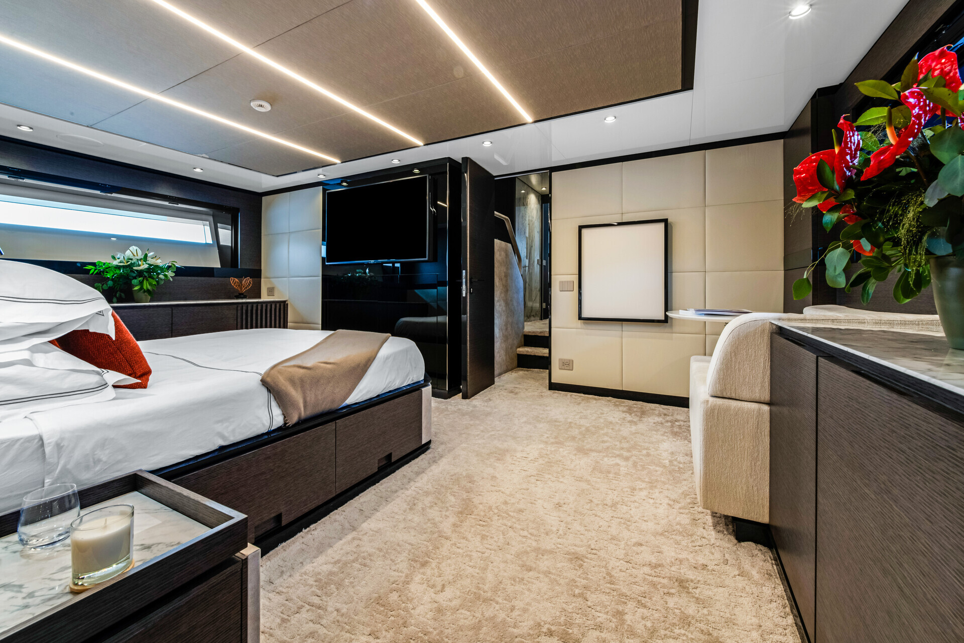 A large, open main salon features an expansive wraparound curved glass panel that allows light to flood in from all directions, creating a light and airy atmosphere onboard. the MARTITA Yacht accommodates eight guests in four spacious cabins: a full-beam master cabin, a VIP cabin, and two twin cabins, all with ensuite facilities.
