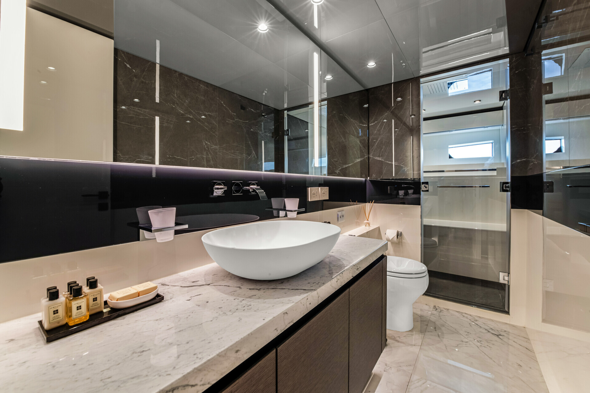 It would be amiss not to draw attention to what most prospective yacht owners notice first about MARTITA: her dynamic outline upon the water. A sporty silhouette dissipates to reveal powerful layering of greys and teak.