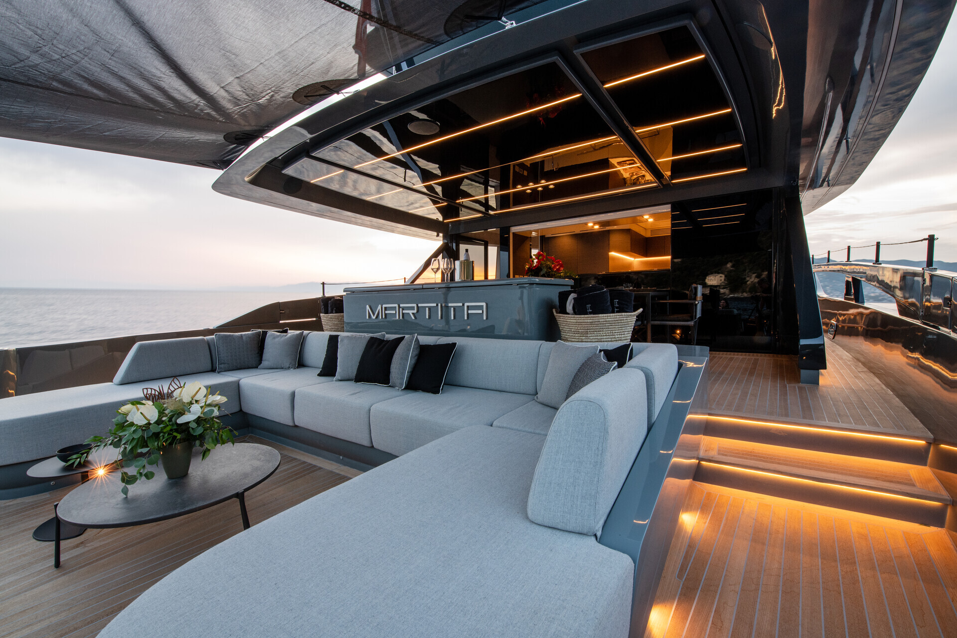 The 50sqm cockpit onboard the MARTITA Yacht celebrates every aspect of the fusion between a private beach club and a yacht, offering the finest moments and features that are hard to beat on any yacht of this size. Indulge in luxurious relaxation at the expansive beach club, where your private chef crafts top-tier cuisine in the open-style kitchen and bar. The DJ console spins your favorite tunes as you cruise in privacy, creating unforgettable memories. MARTITA offers what few yachts can with her full-beam, versatile aft deck — ideal for hosting chic, intimate gatherings, parties, or culinary experiences