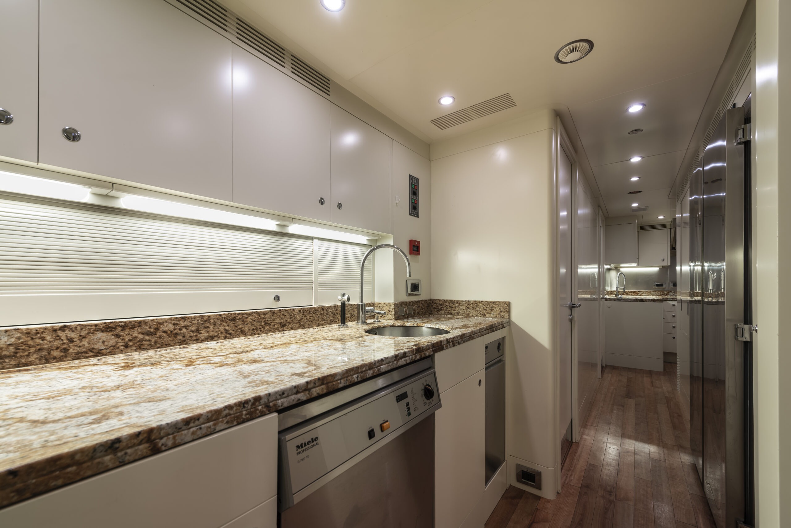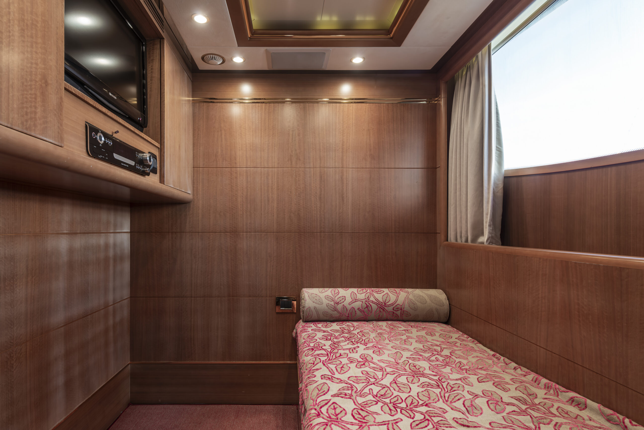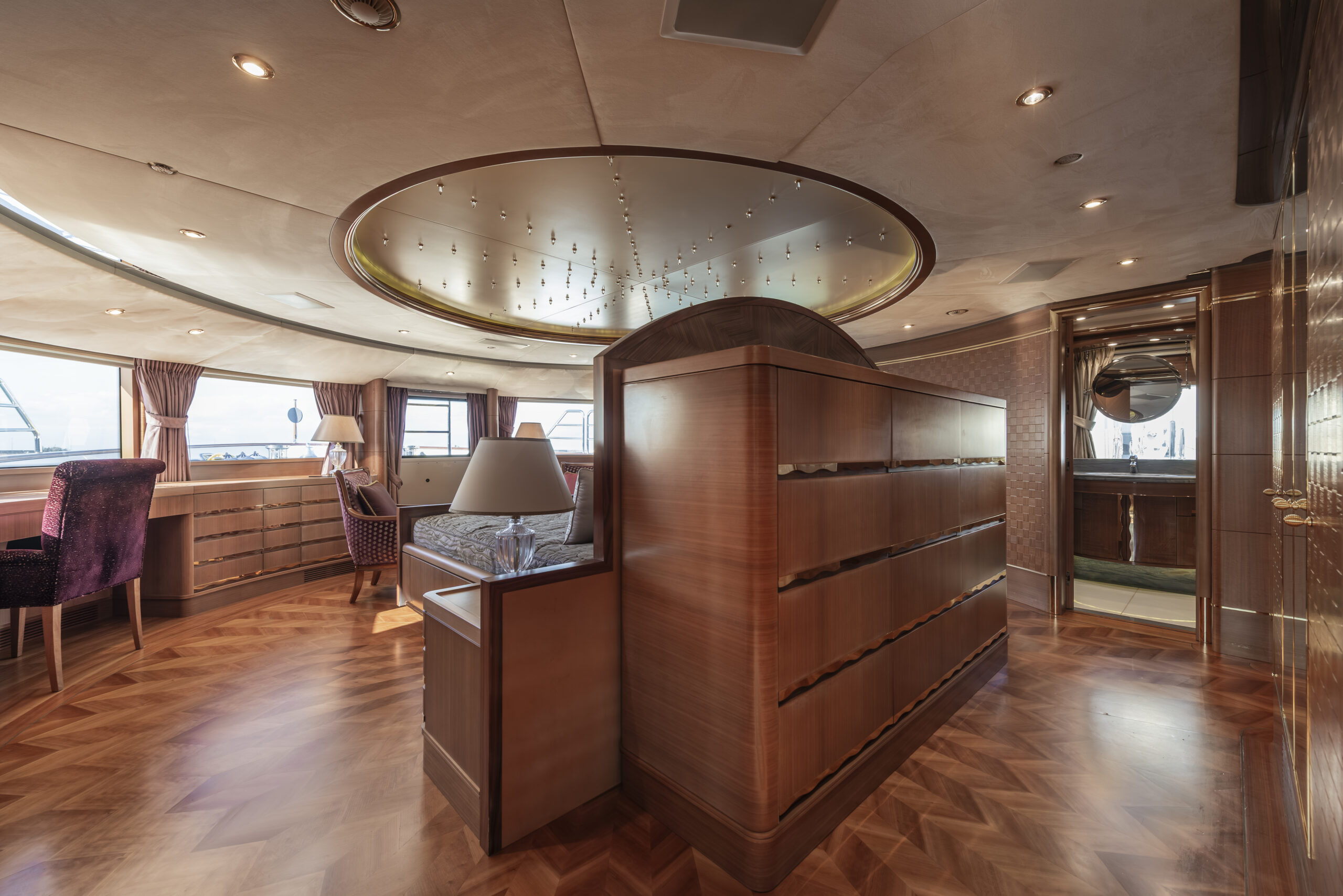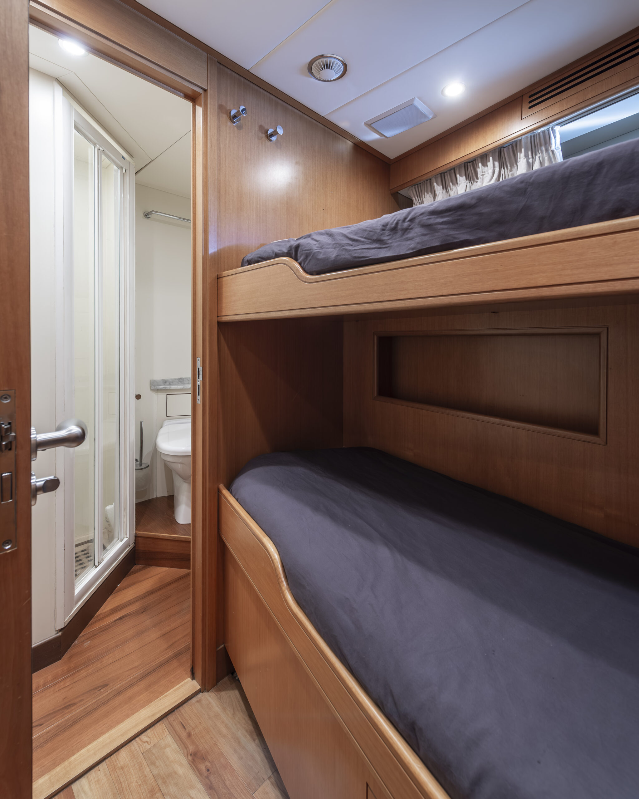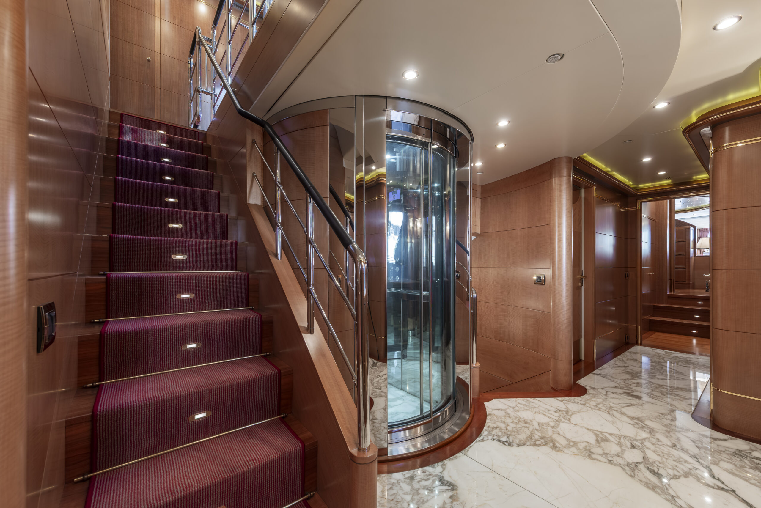 MY SISA sleeps up to 15 guests across seven staterooms, including a forward main-deck master, two doubles and two twins with Pullmans on the lower deck, a bridge-deck VIP, and a flexible single cabin adjacent to the master – ideal as an office or nanny room. An elevator connects all decks, offering accessibility rarely seen in this size category.