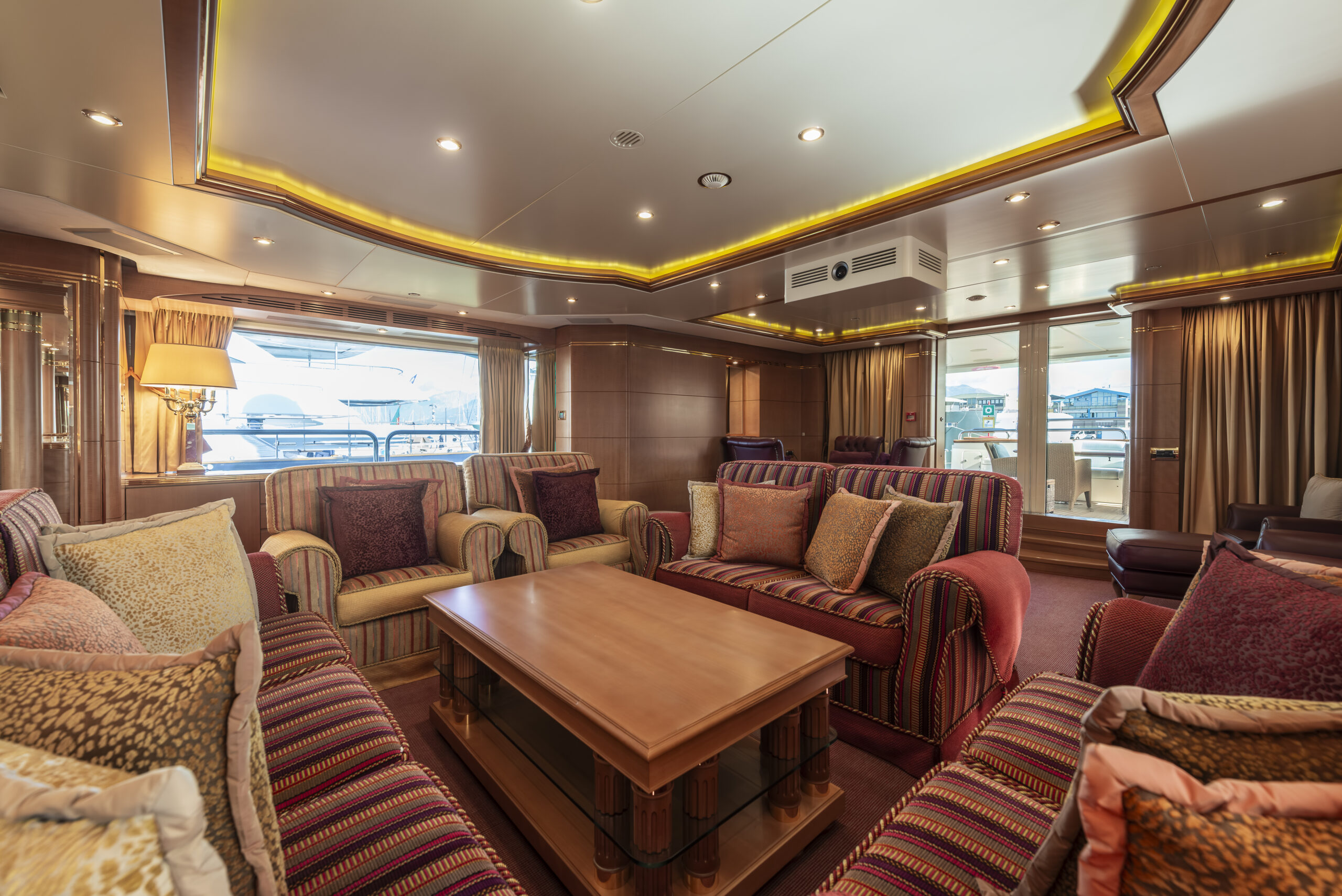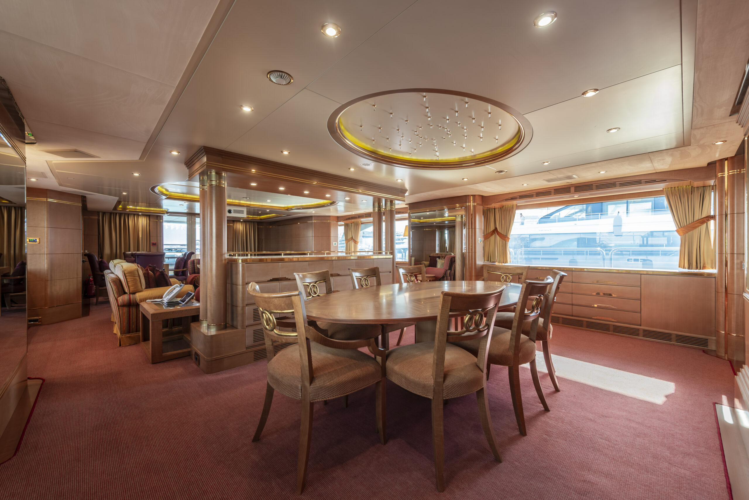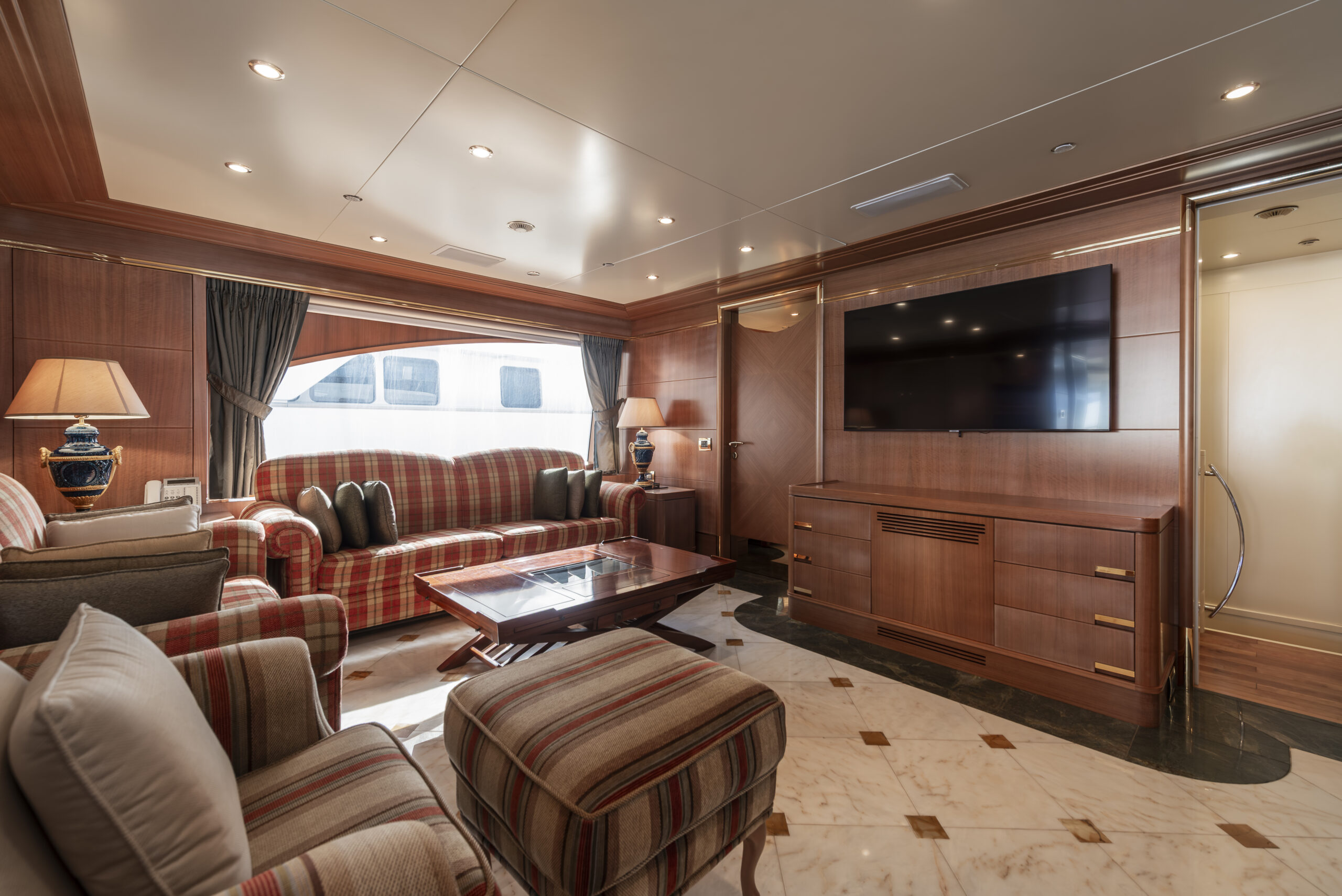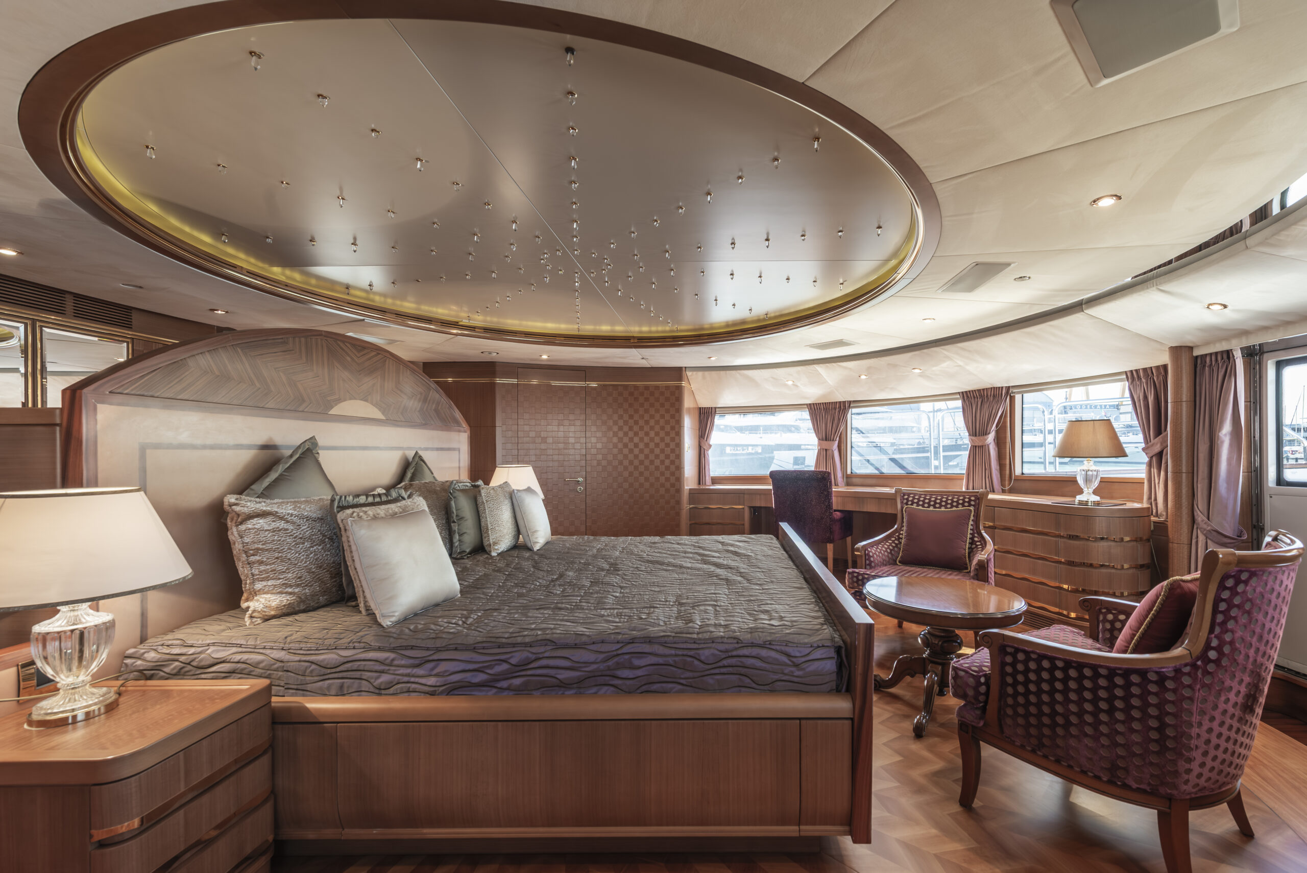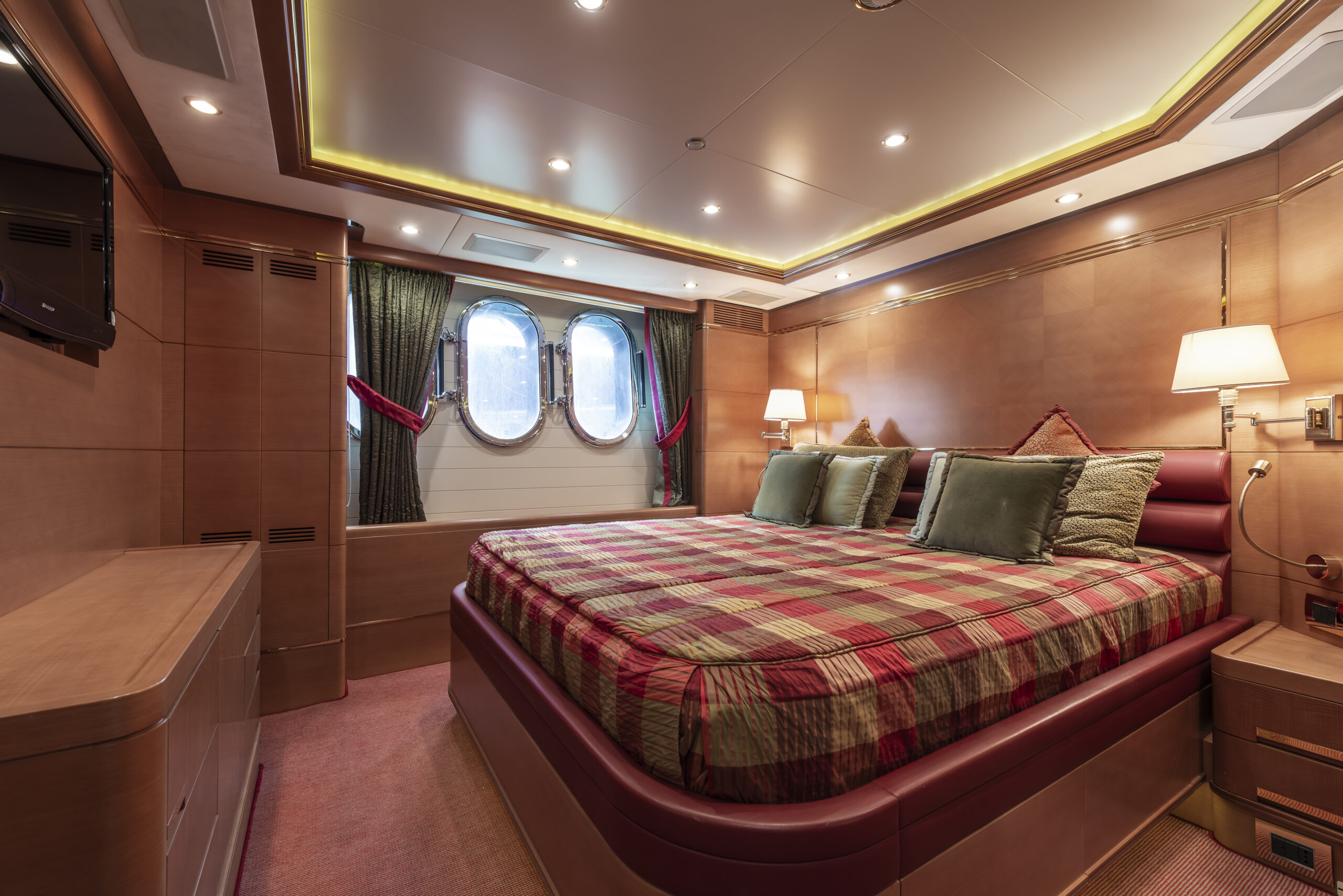 With a length of 44.2m and a volume of 456 GT, MY SISA offers a versatile seven-cabin layout for up to 15 guests. Her spacious master suite sits forward on the main deck, complemented by two doubles and two twins with Pullman berths on the lower deck, a VIP cabin on the bridge deck, and a single cabin convertible into an office or additional guest space. A rare feature in this size range, the yacht also boasts an elevator serving all decks.