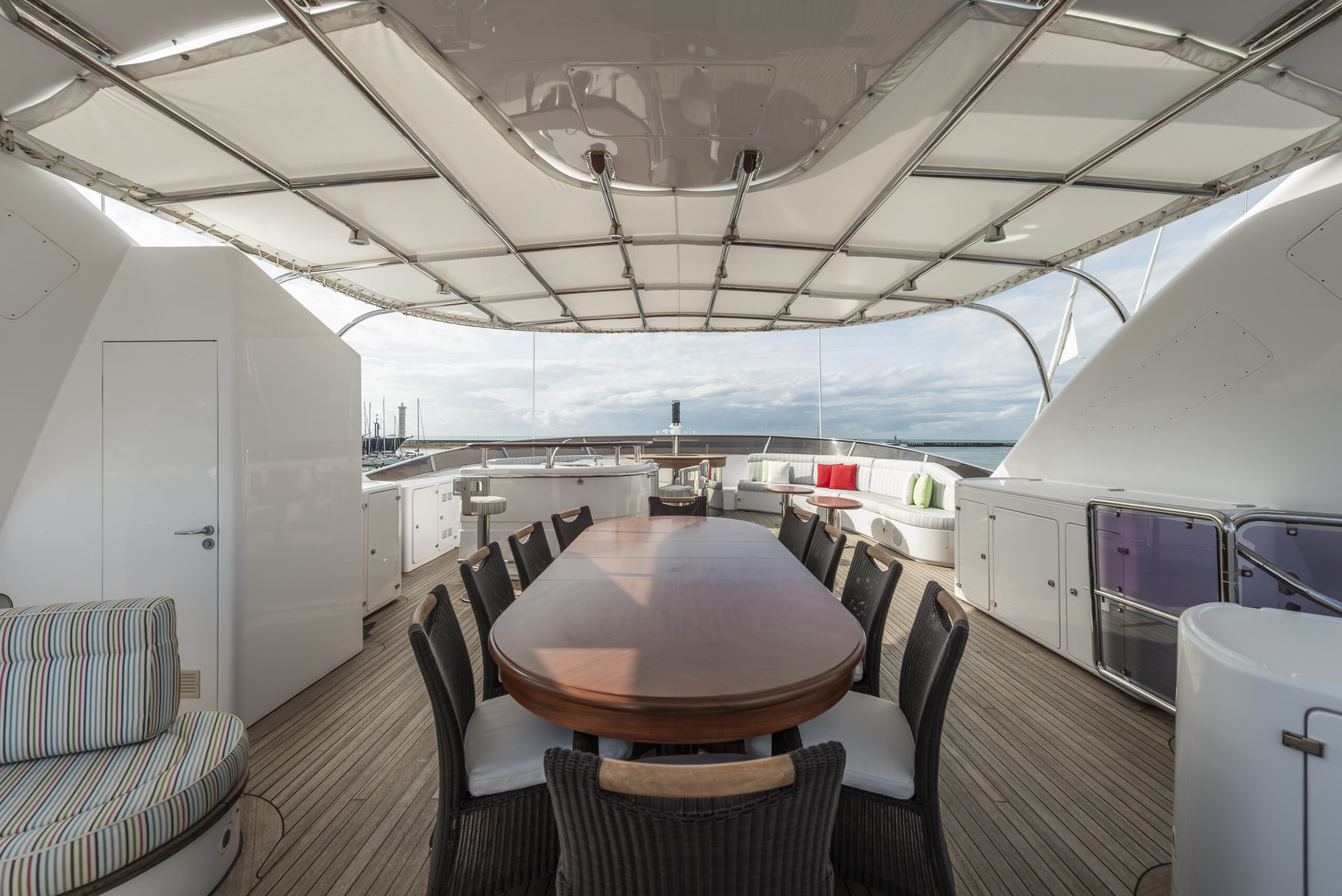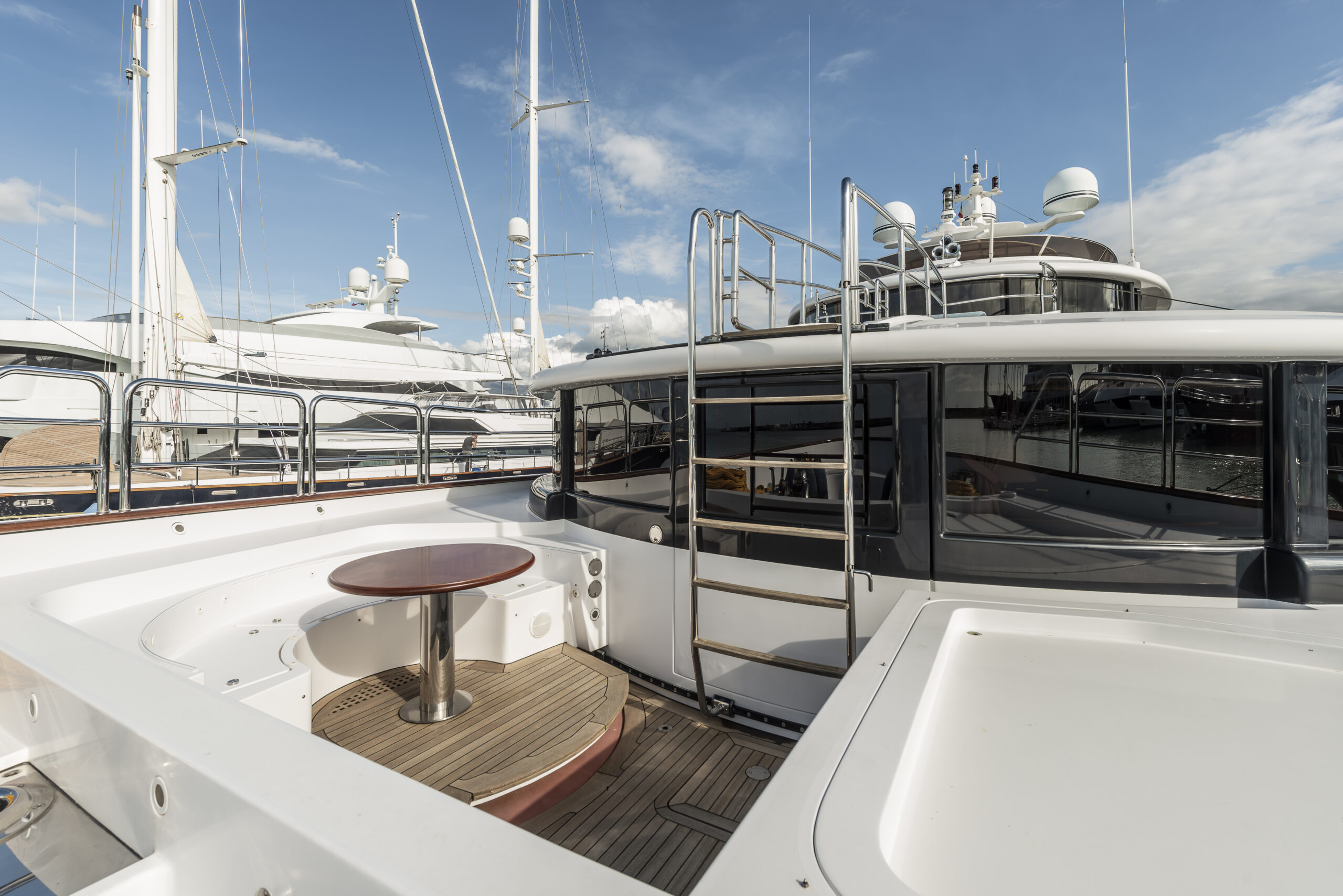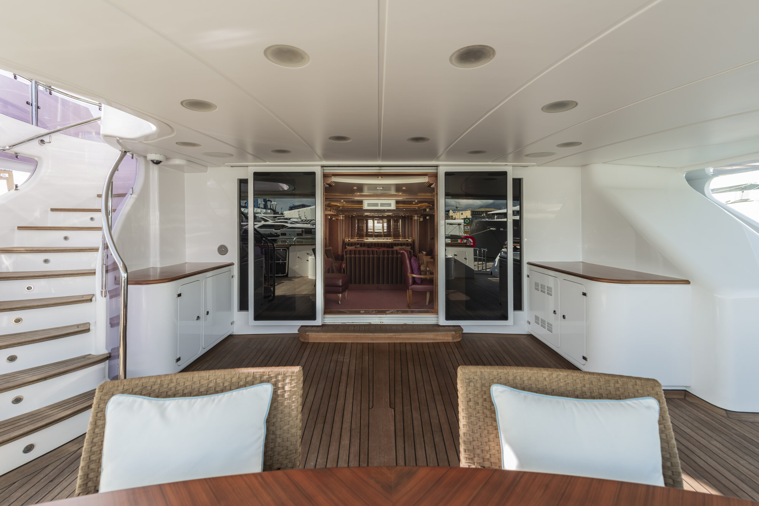 Designed for relaxed Mediterranean cruising, MY SISA features expansive exterior decks including a large sundeck with jacuzzi, twin BBQs, sun loungers, and a bar. Her foredeck terrace, upper deck dining area, and aft lounges provide multiple zones for entertaining, lounging, or private retreat.