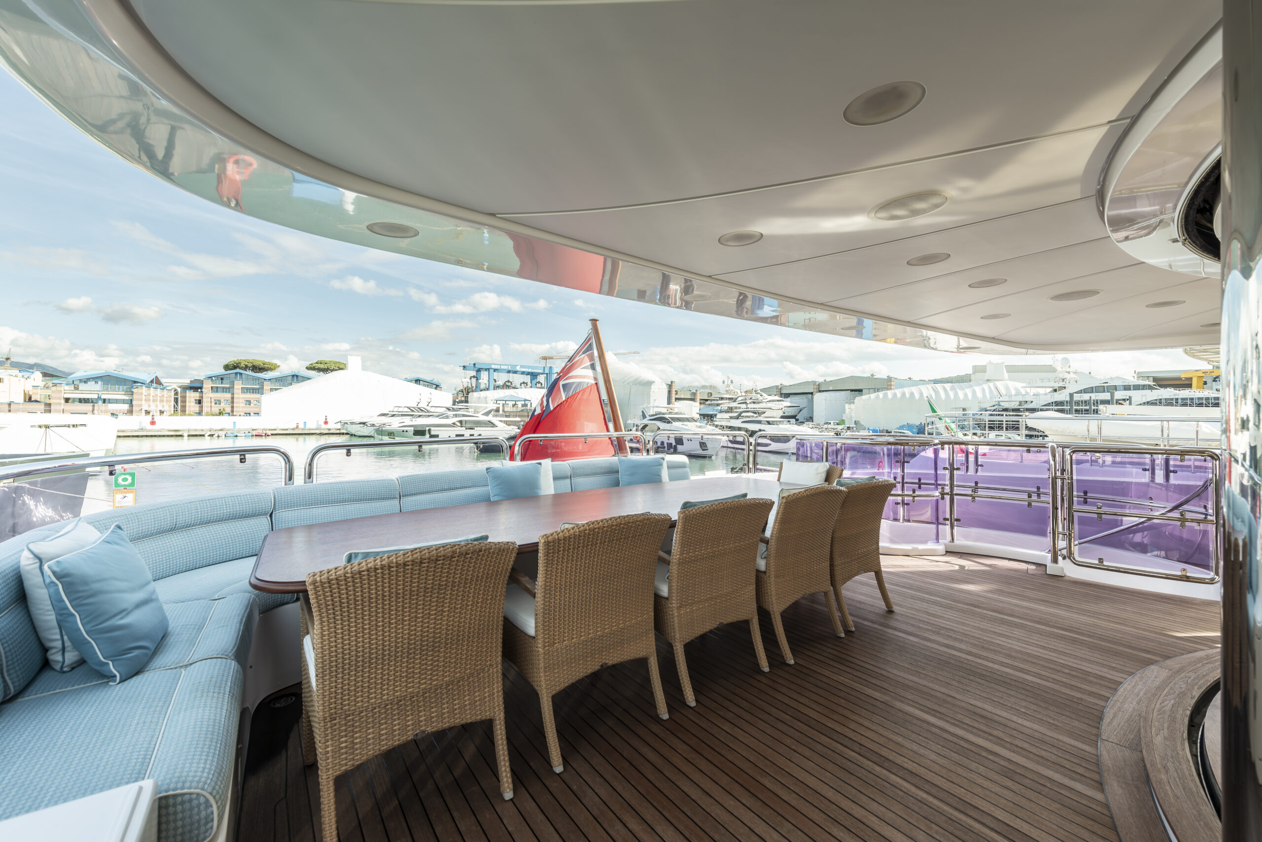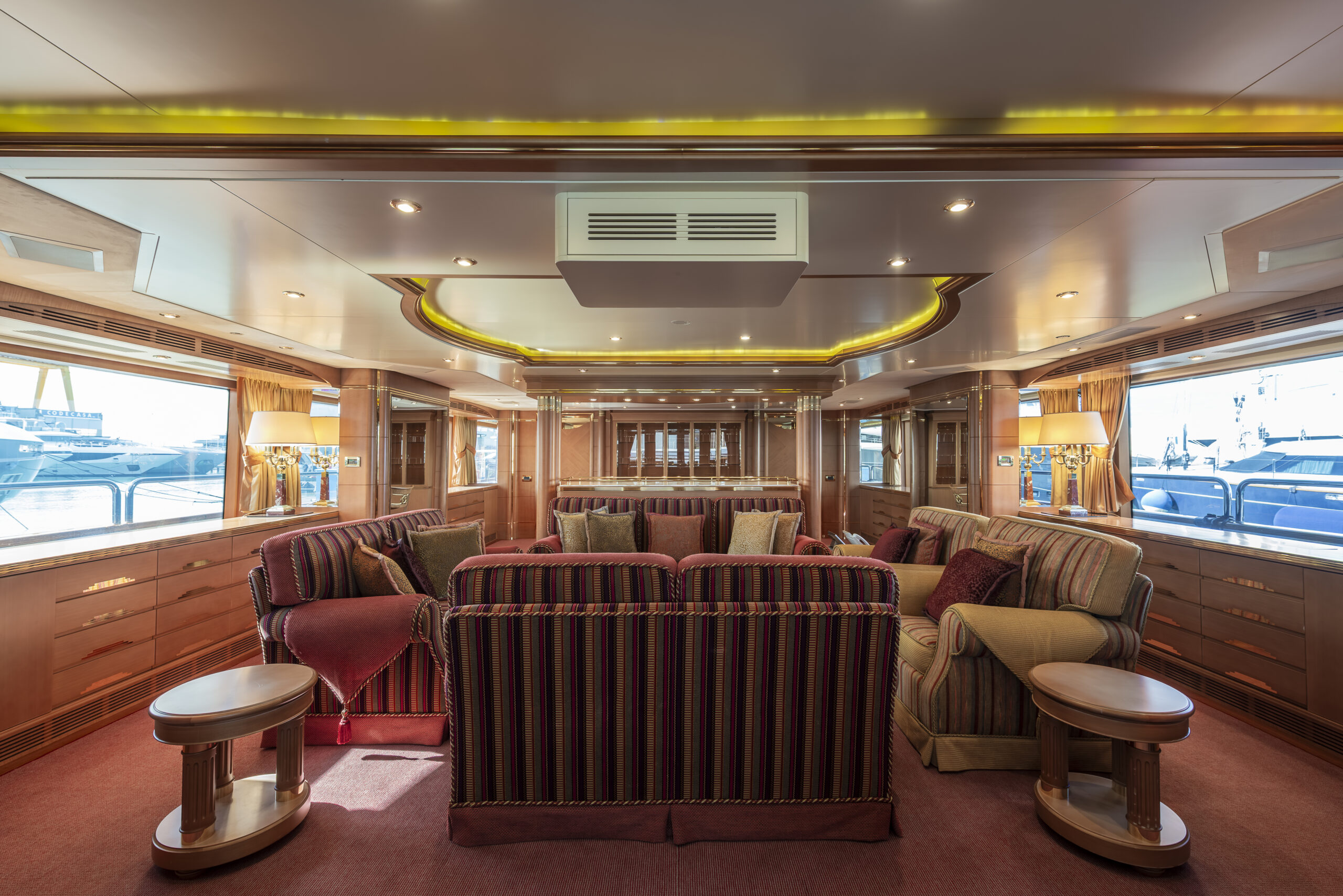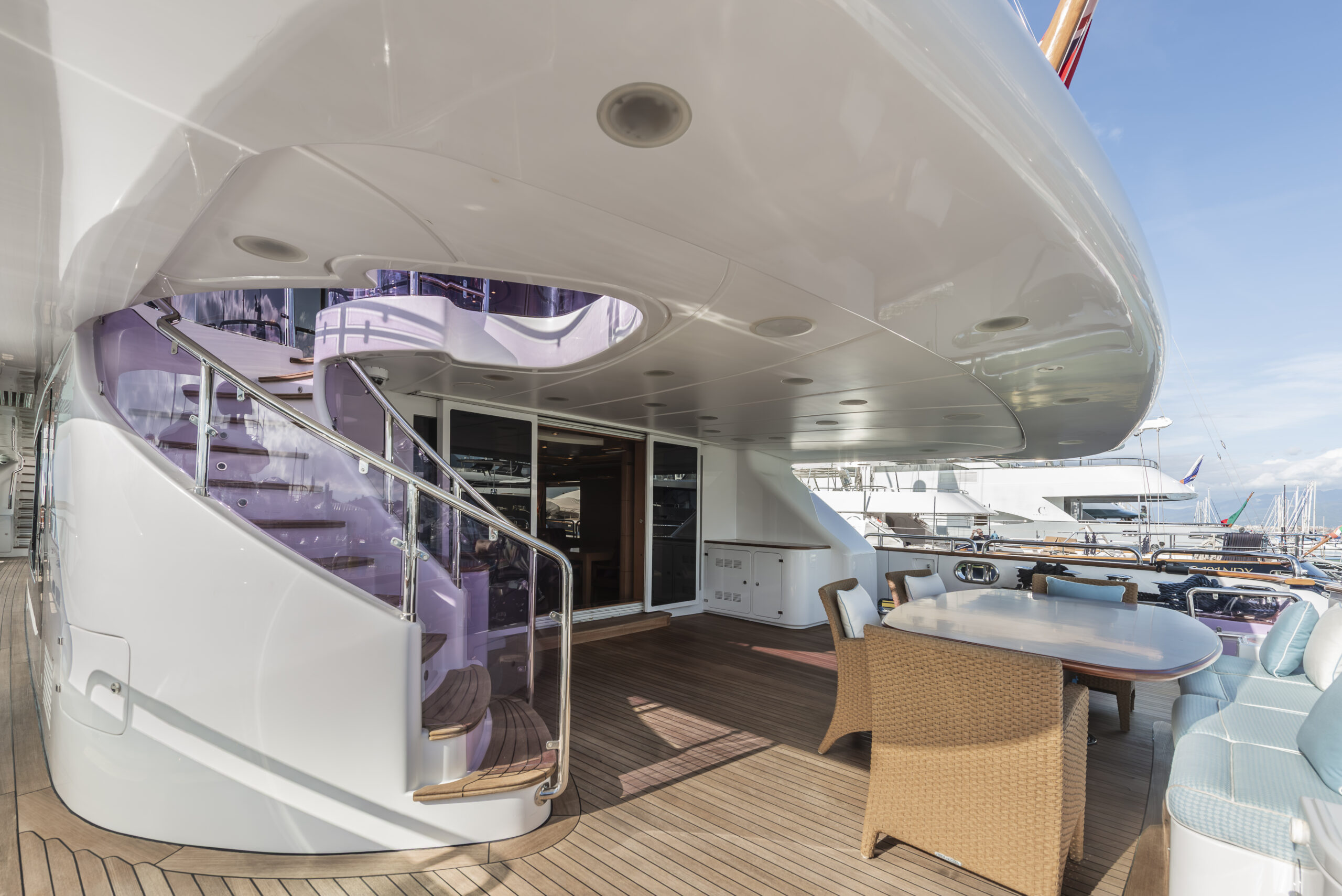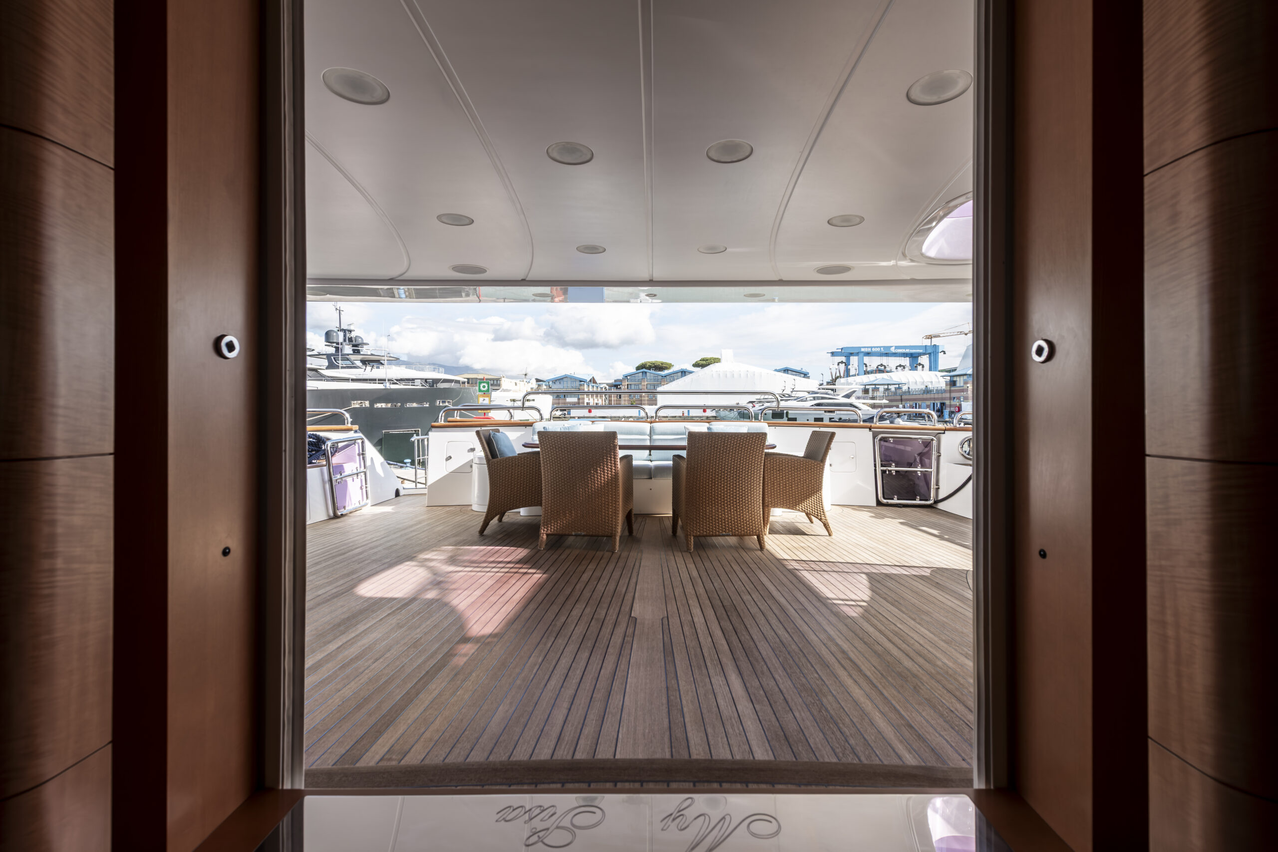 Designed for relaxed Mediterranean cruising, MY SISA features expansive exterior decks including a large sundeck with jacuzzi, twin BBQs, sun loungers, and a bar. Her foredeck terrace, upper deck dining area, and aft lounges provide multiple zones for entertaining, lounging, or private retreat.