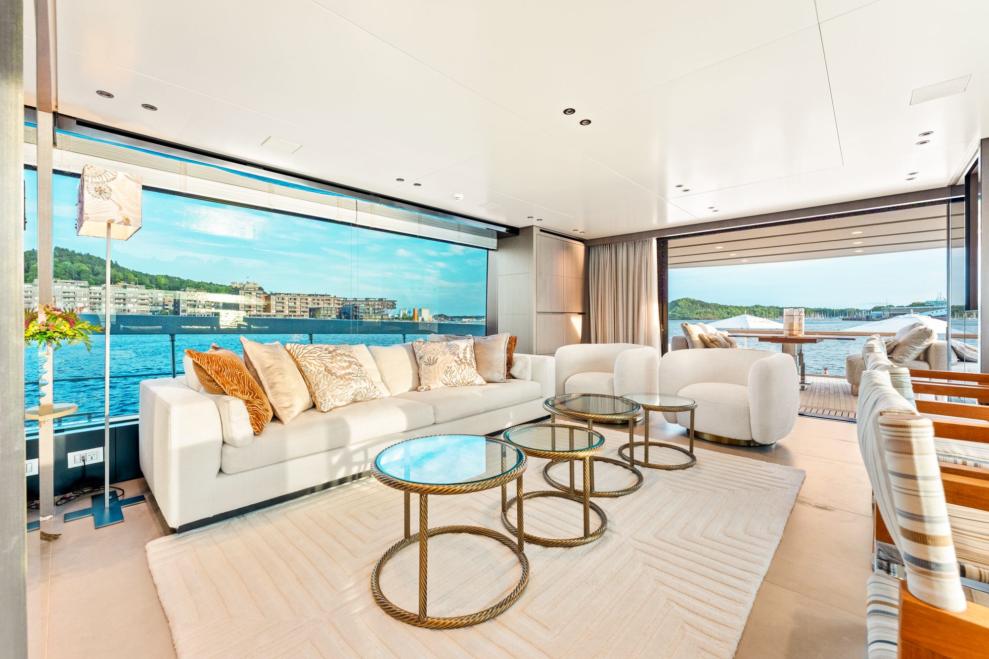 The spacious, light-filled salon celebrates open-plan living, highlighted by a custom-made unique dining concept seamlessly integrating the main deck living areas from the beach area all the way through to the entertainment focused open galley.