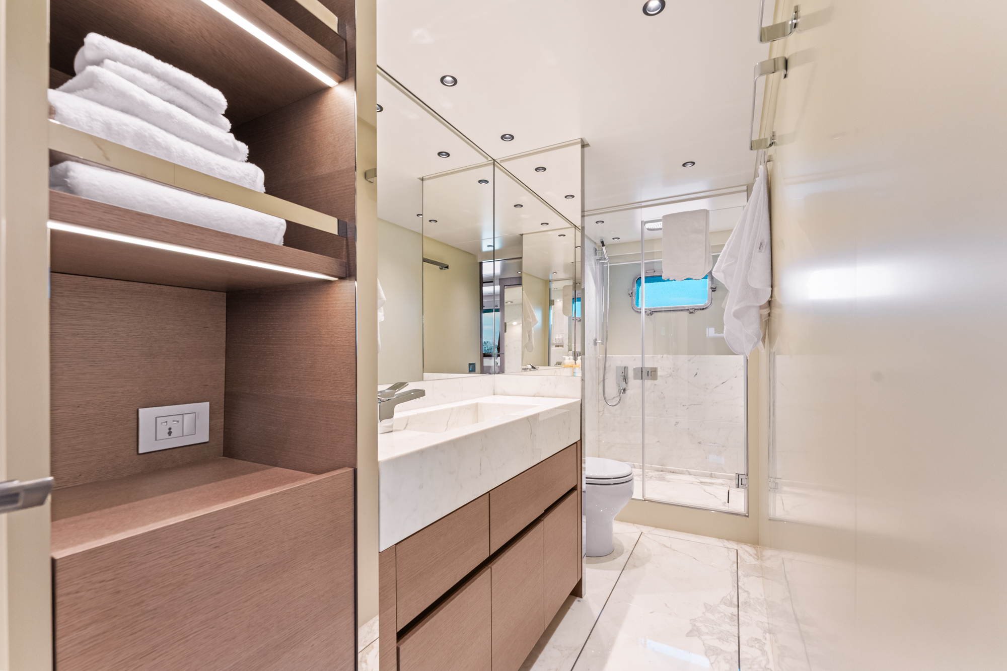 NORTH has accommodation for up to eight guests across four beautifully appointed ensuite cabins. Located midships on the lower deck, the full-beam master suite provides a serene private retreat, while her guest accommodation includes a large VIP cabin and two elegant twin cabins, all of which enjoy ensuite bathroom facilities. NORTH also has accommodation for her four person crew on the lower deck