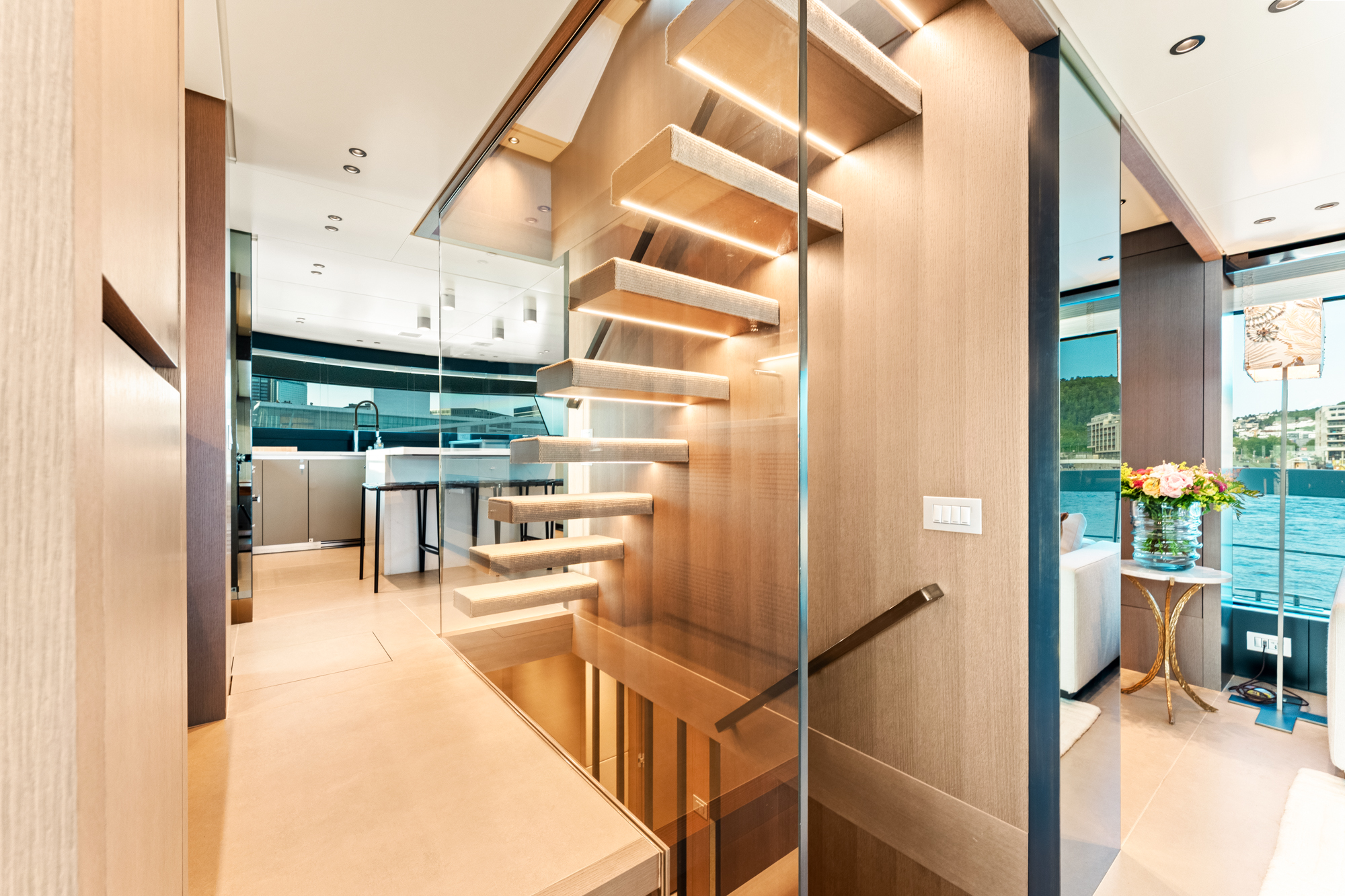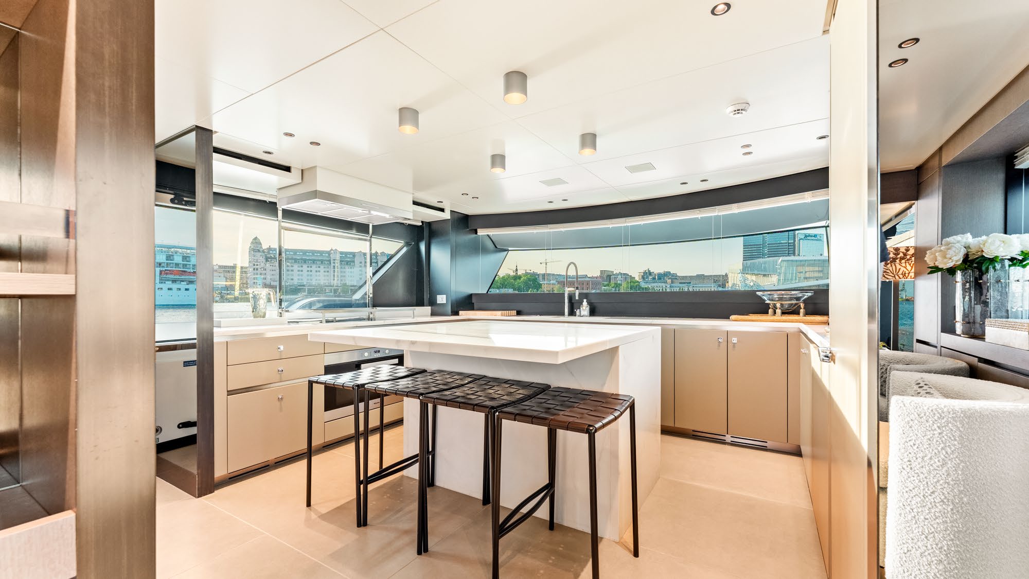 Moving inside, NORTH’s interior celebrates open-plan living with full-length windows leading from the beach club through to the main living area. The ideal yacht for entertaining or relaxed family cruising, her bespoke furnishings and flexible layout showcase an interior designed for both comfort and creativity, setting her apart from every other SX88 yacht in the series.