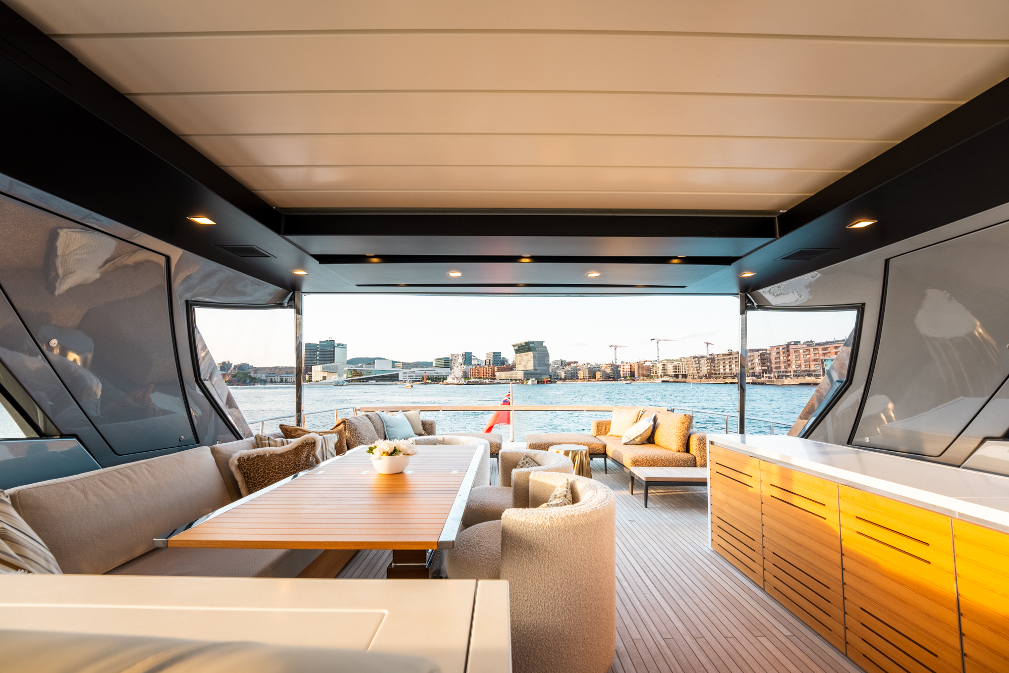 Designed for those in search of the outdoor lifestyle, NORTH’s main deck flows effortlessly into the beach club, creating a spacious, open area for socialising, while her flybridge features a bar, teppanyaki grill and flexible lounge areas for al fresco dining. A generous seating area in the bow provides multiple options for casual meals, sunbathing or simply enjoying the view.