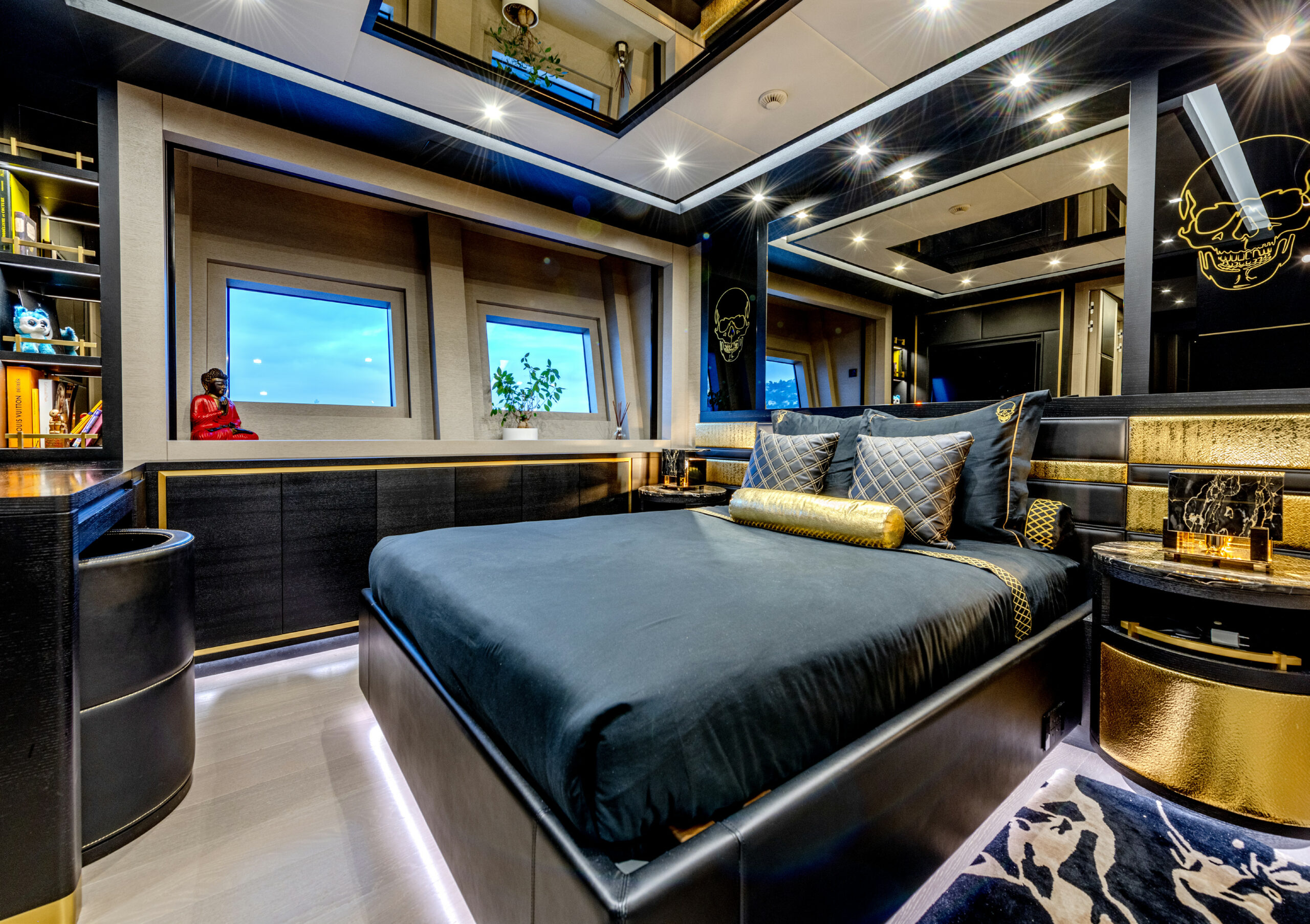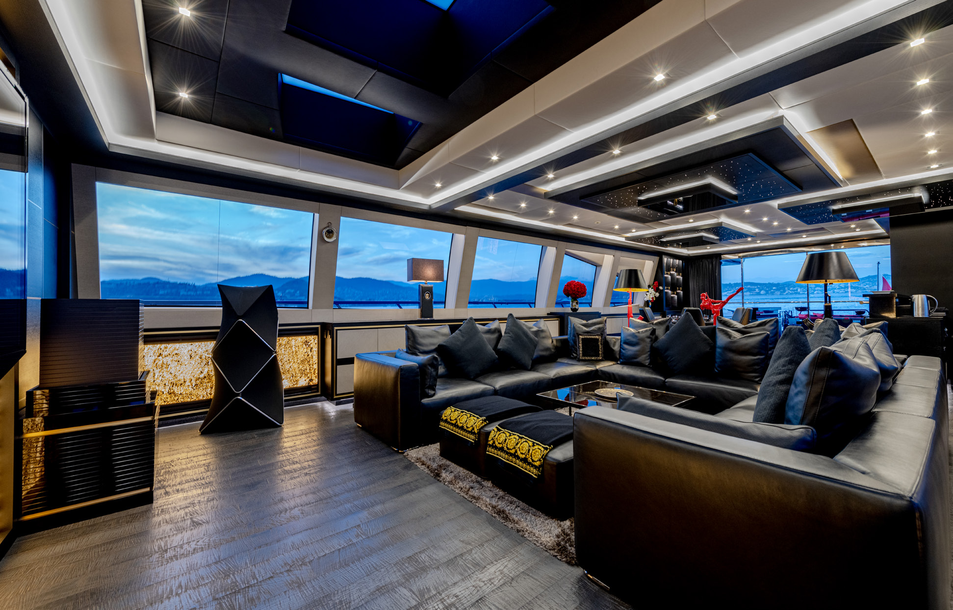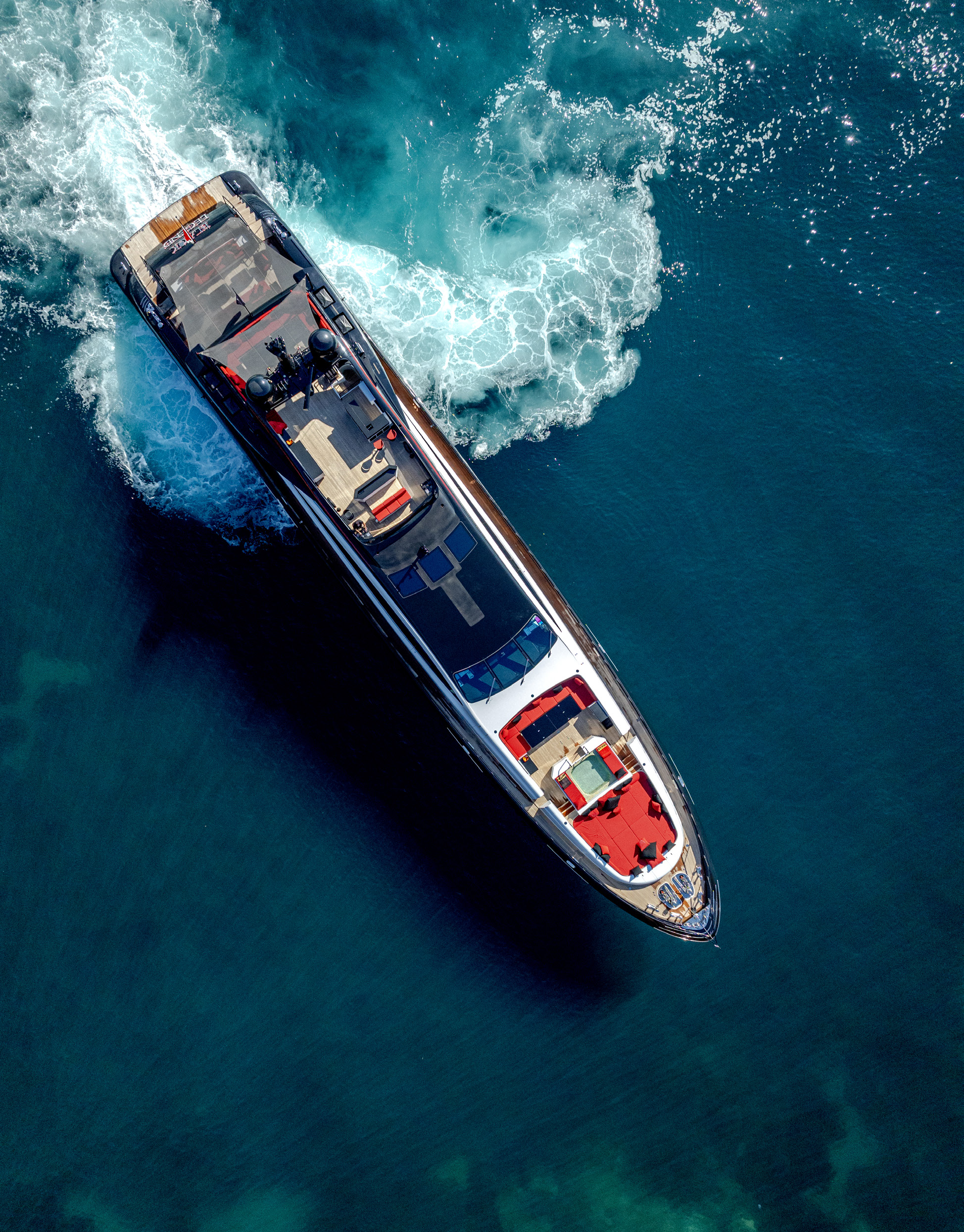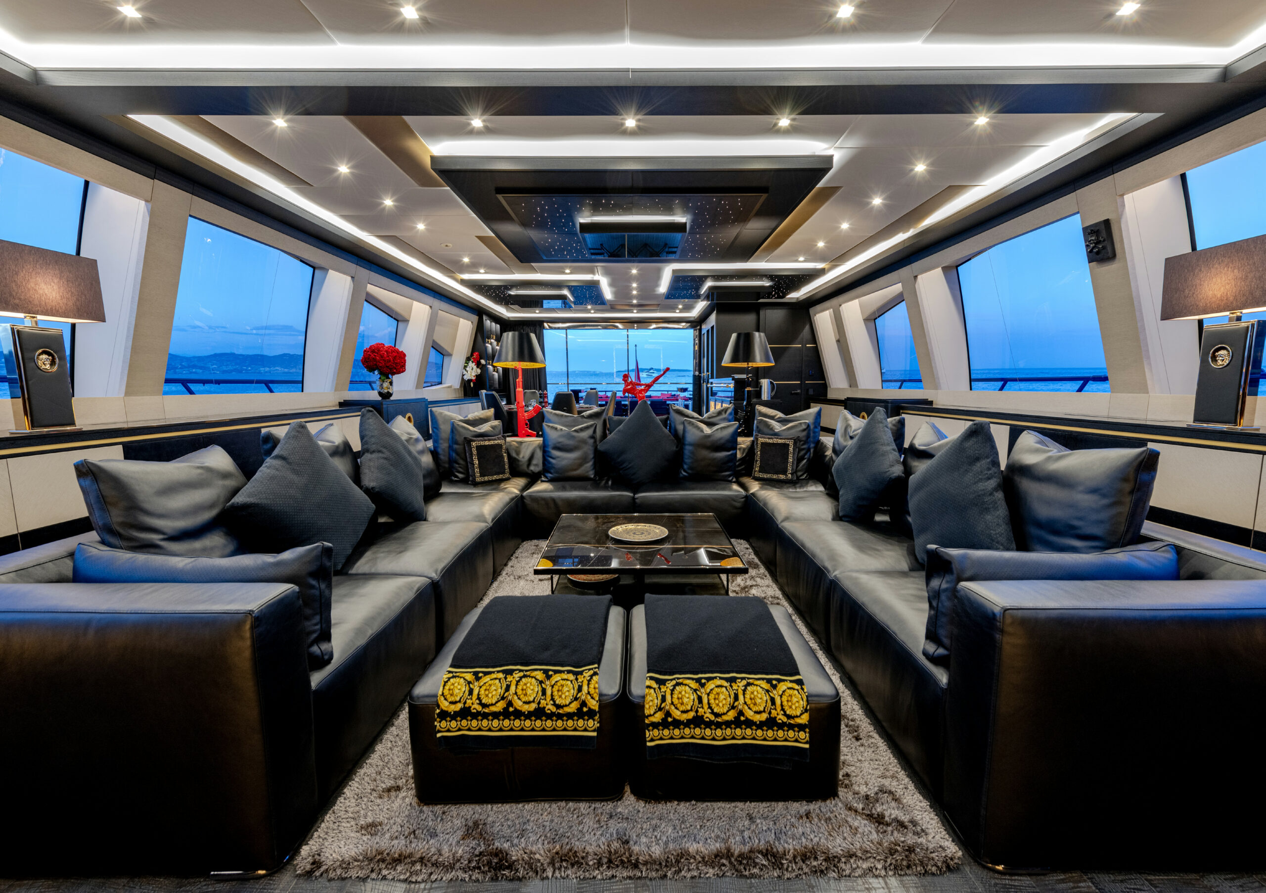 Her sleek black hull and striking exterior profile make BLACK LEGEND a head-turner in every marina. With 425m² of combined interior and exterior guest areas, designed with meticulous attention to detail, the interiors feature a sophisticated blend of light and dark wood, marble finishes, and luxurious touches from renowned designers such as Minotti and Versace.