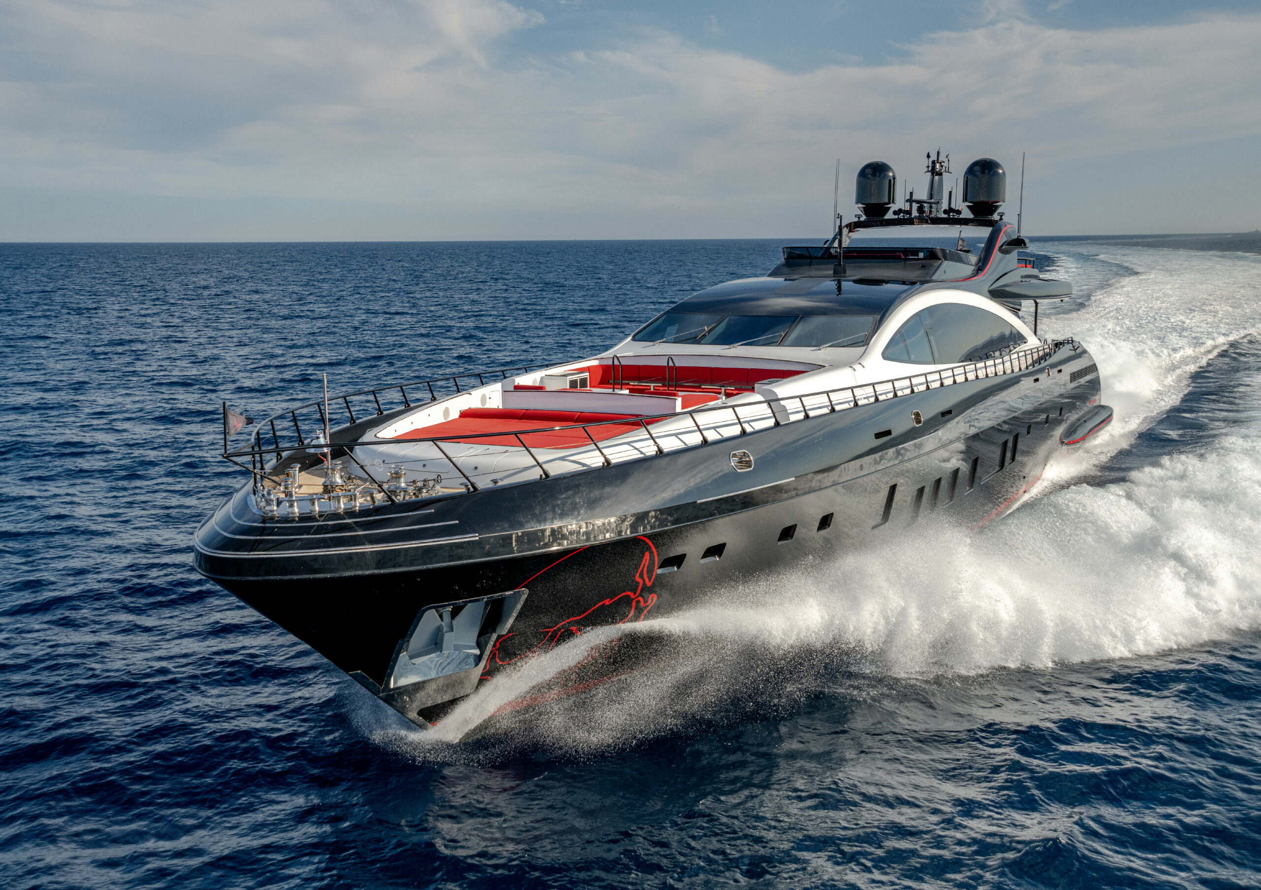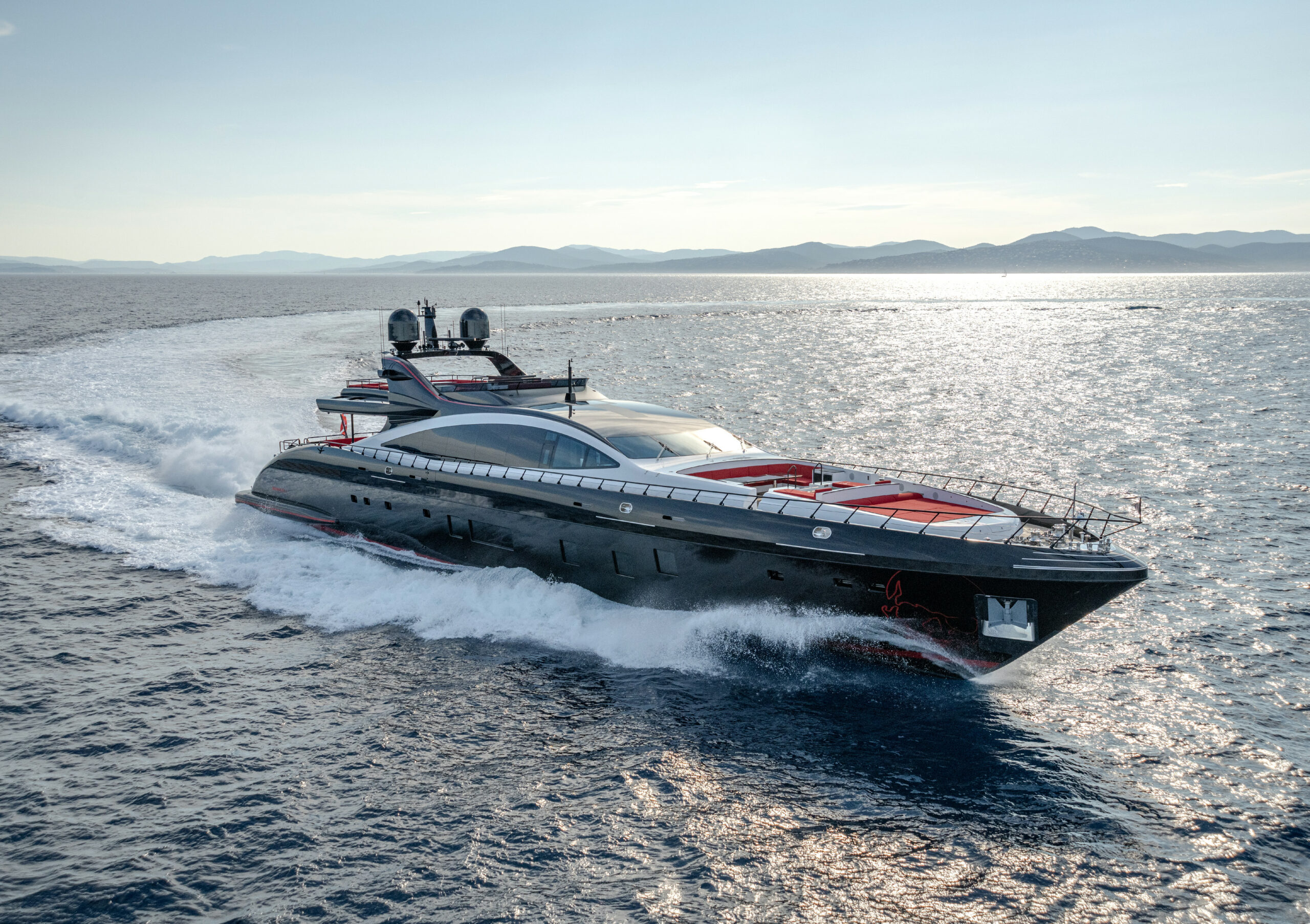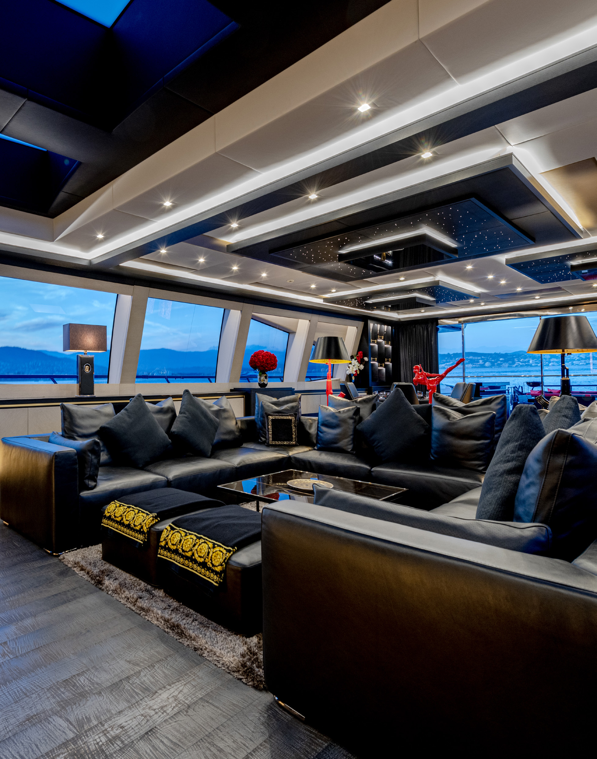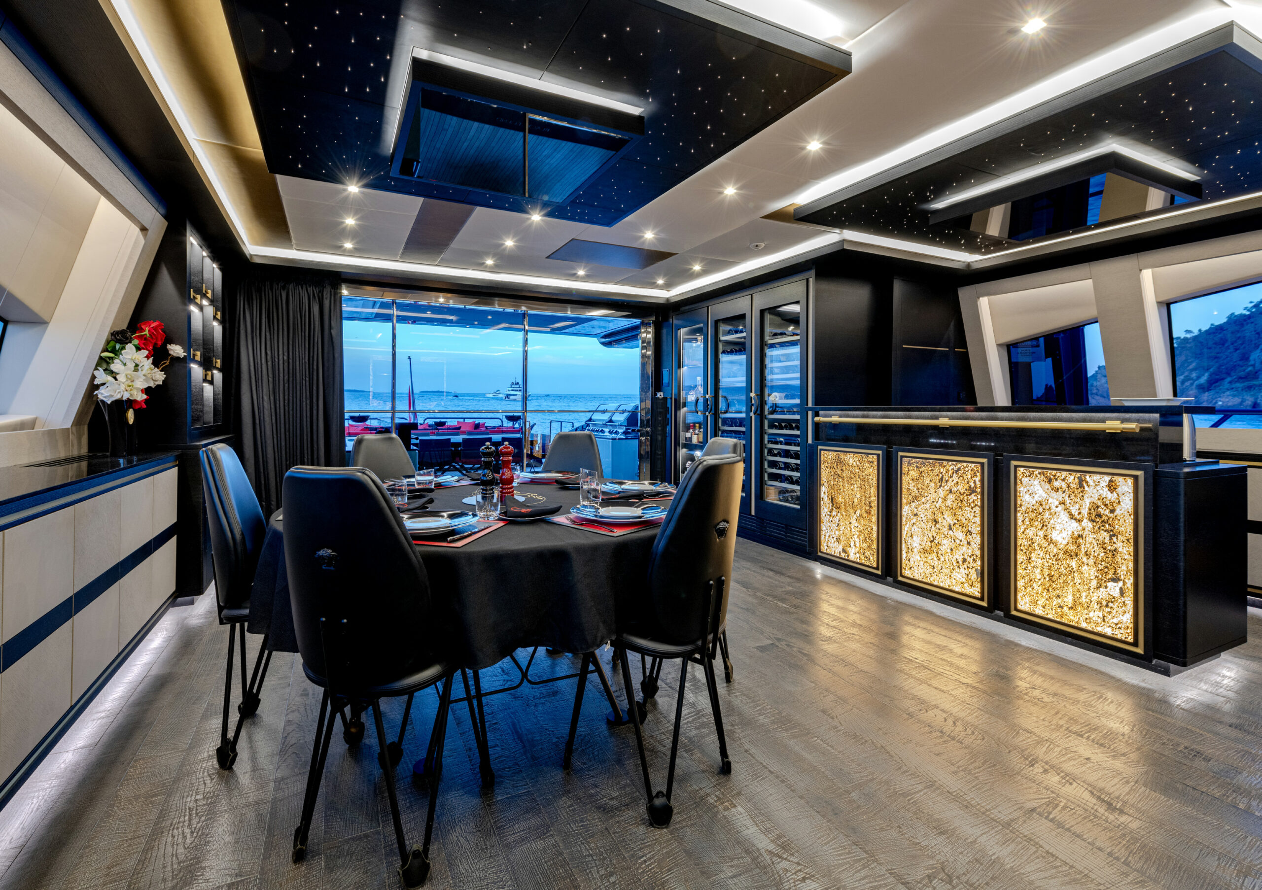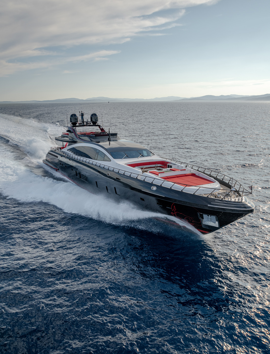 Her sleek black hull and striking exterior profile make BLACK LEGEND a head-turner in every marina. With 425m² of combined interior and exterior guest areas, designed with meticulous attention to detail, the interiors feature a sophisticated blend of light and dark wood, marble finishes, and luxurious touches from renowned designers such as Minotti and Versace.