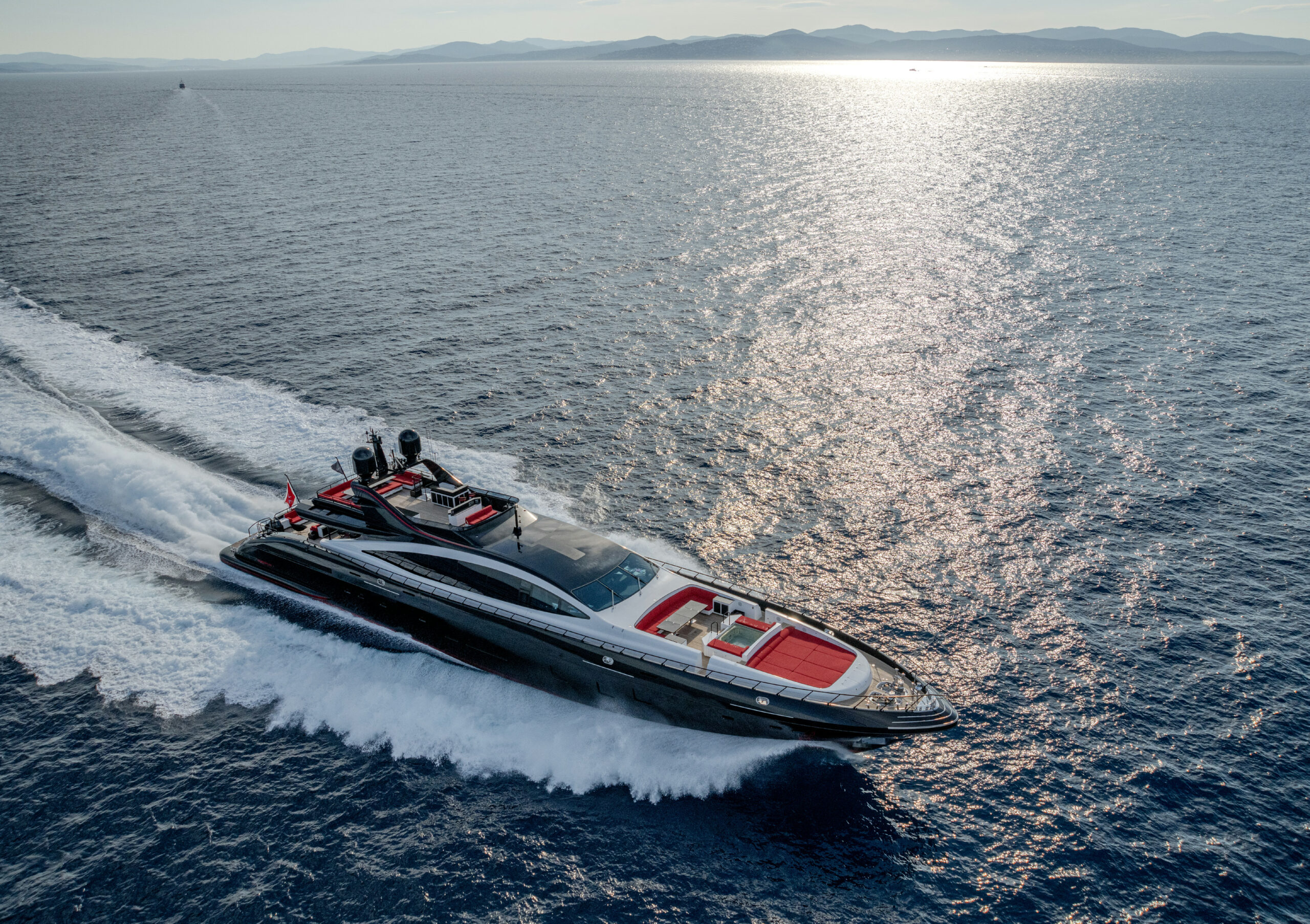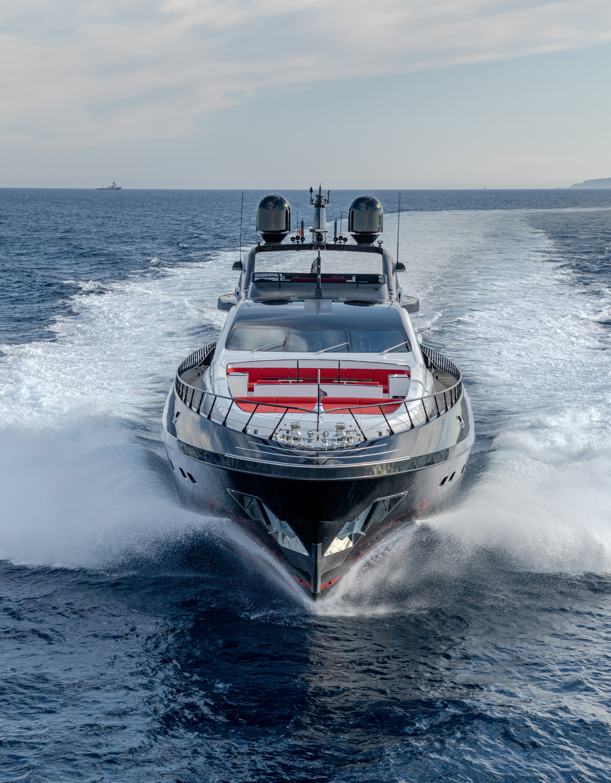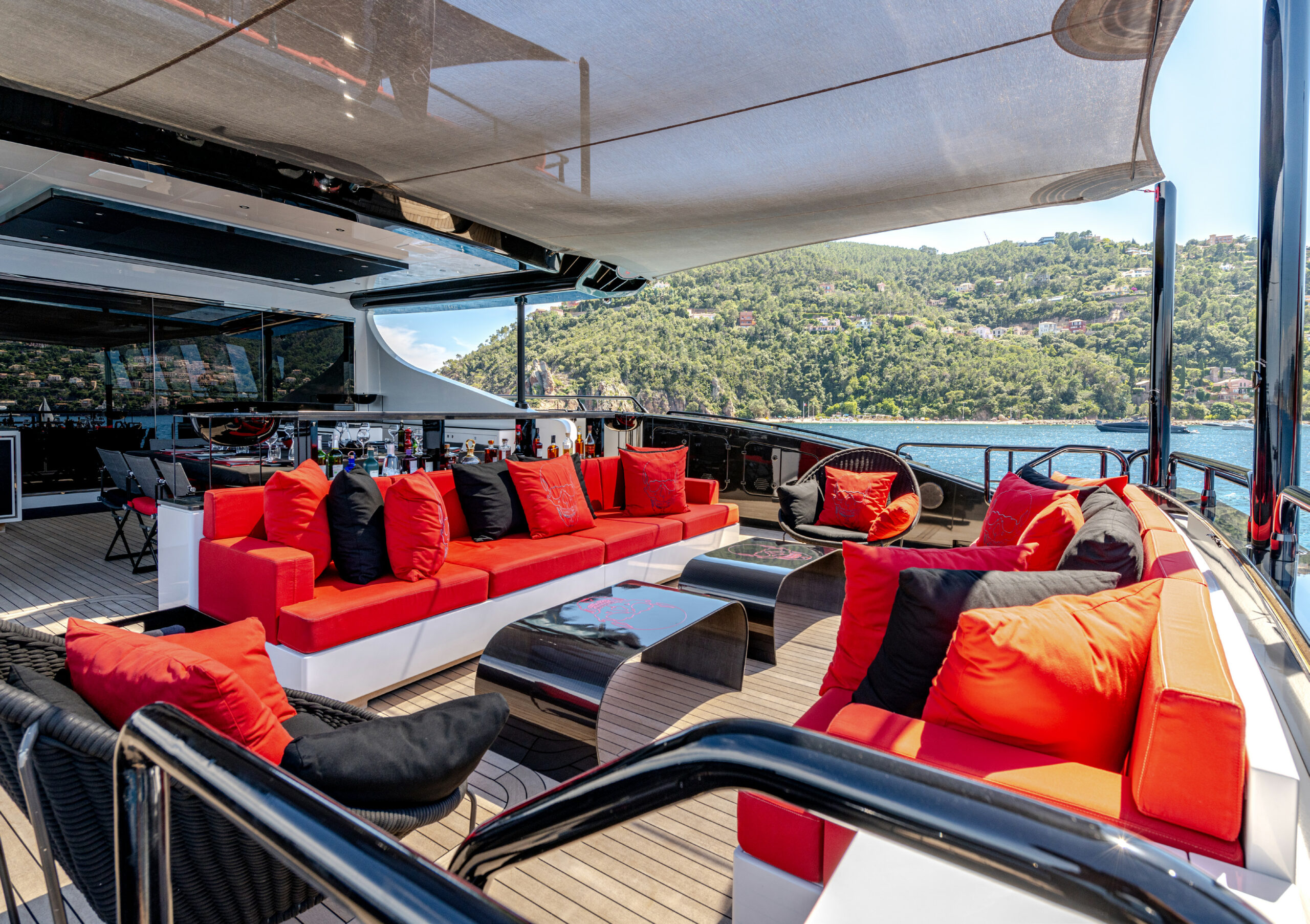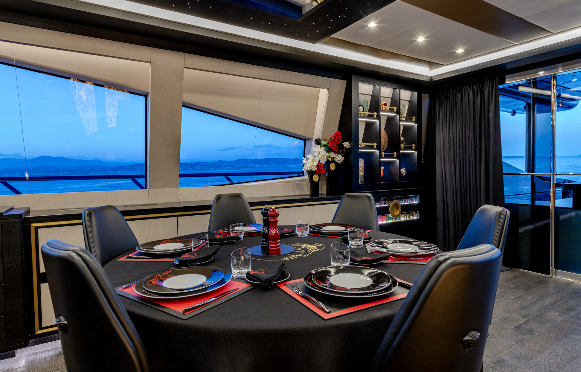 Her sleek black hull and striking exterior profile make BLACK LEGEND a head-turner in every marina. With 425m² of combined interior and exterior guest areas, designed with meticulous attention to detail, the interiors feature a sophisticated blend of light and dark wood, marble finishes, and luxurious touches from renowned designers such as Minotti and Versace.