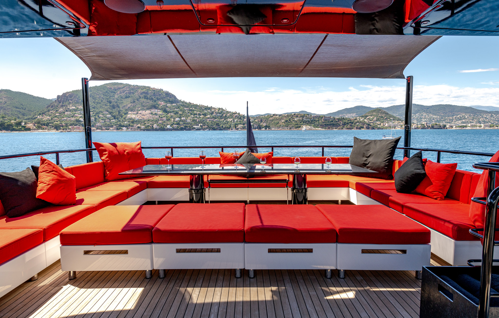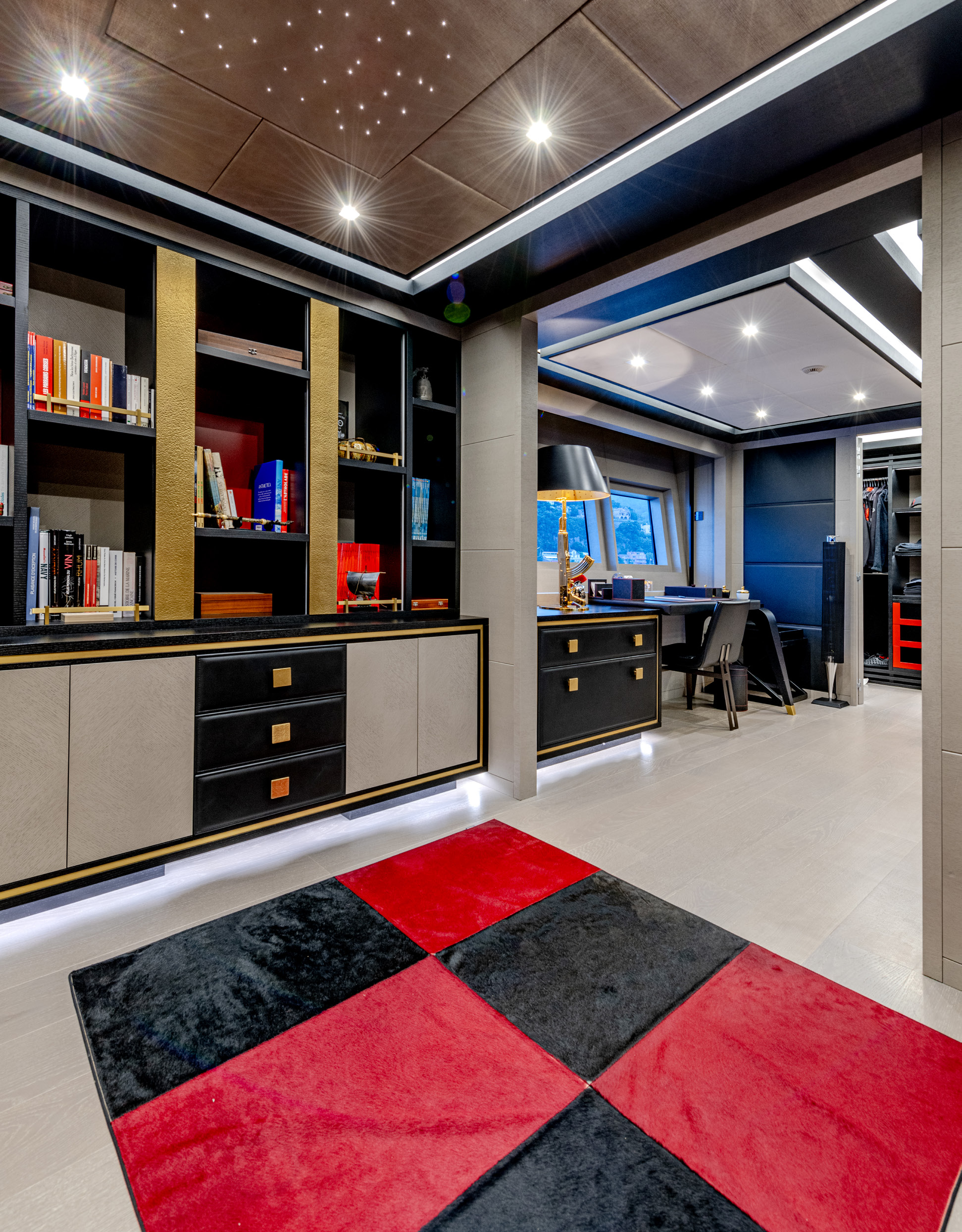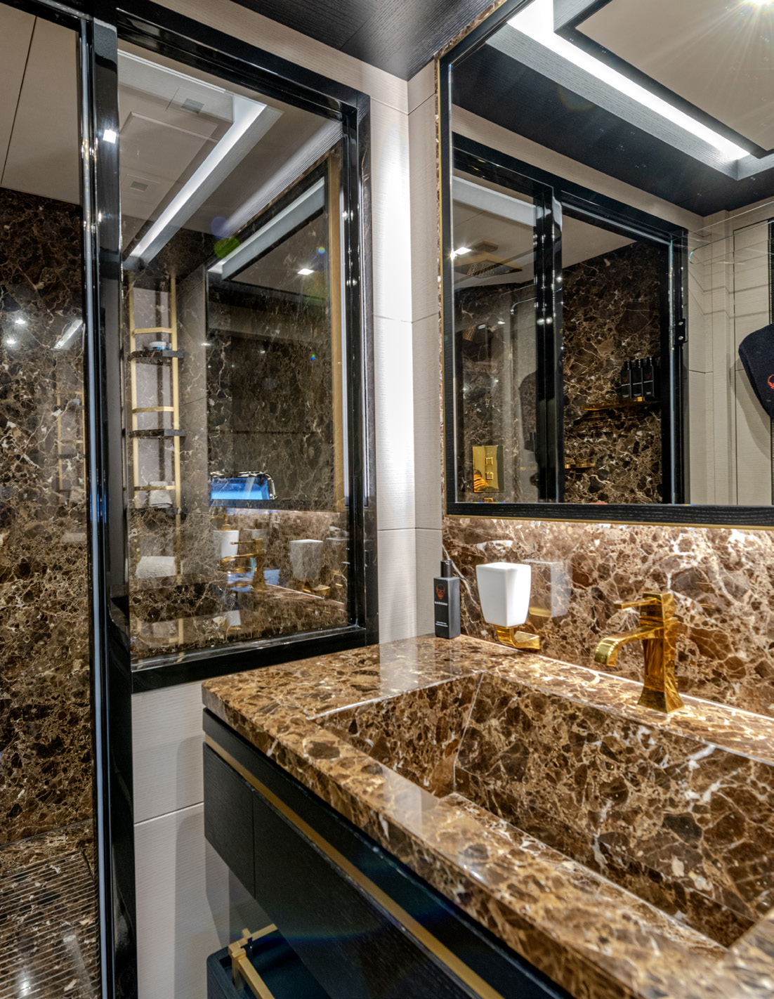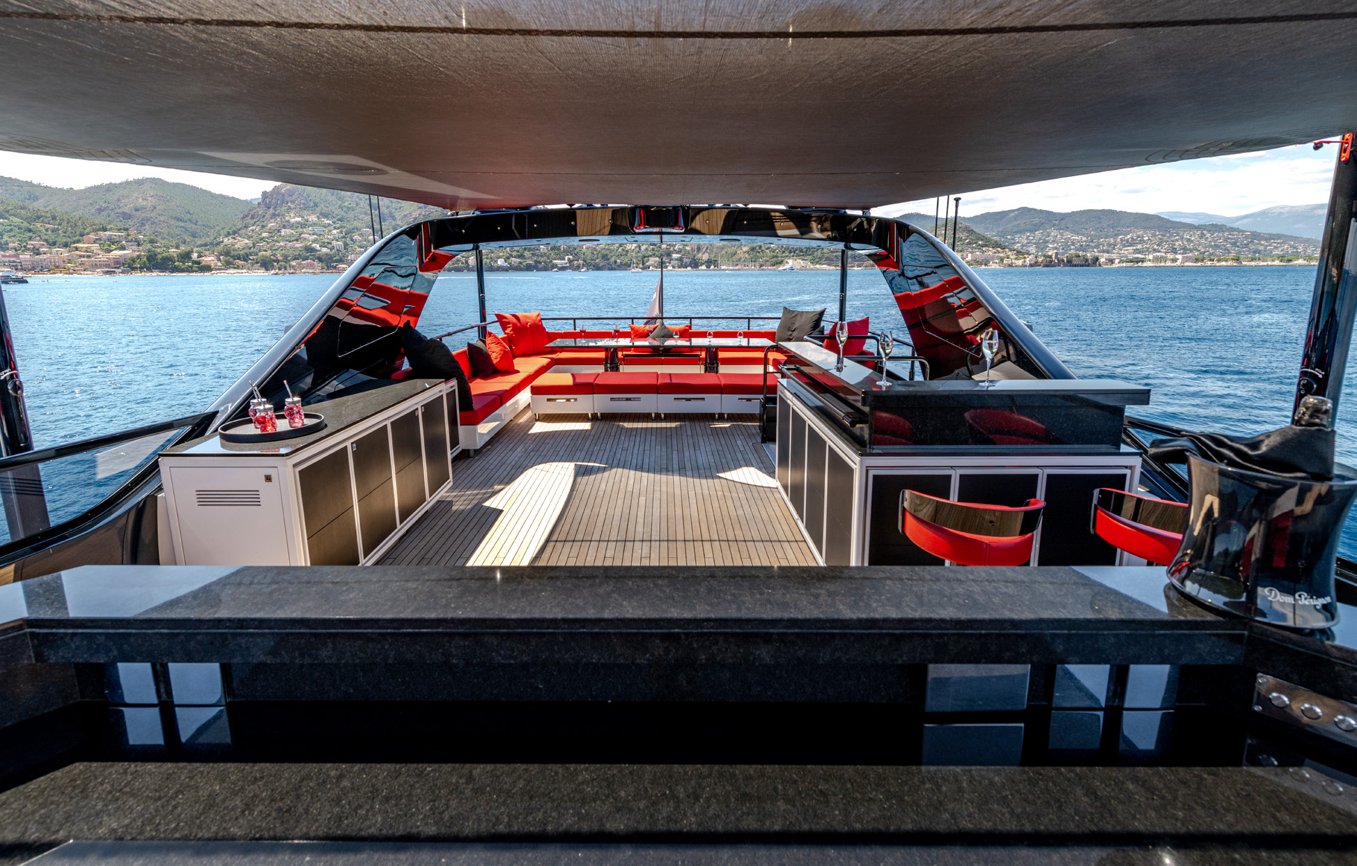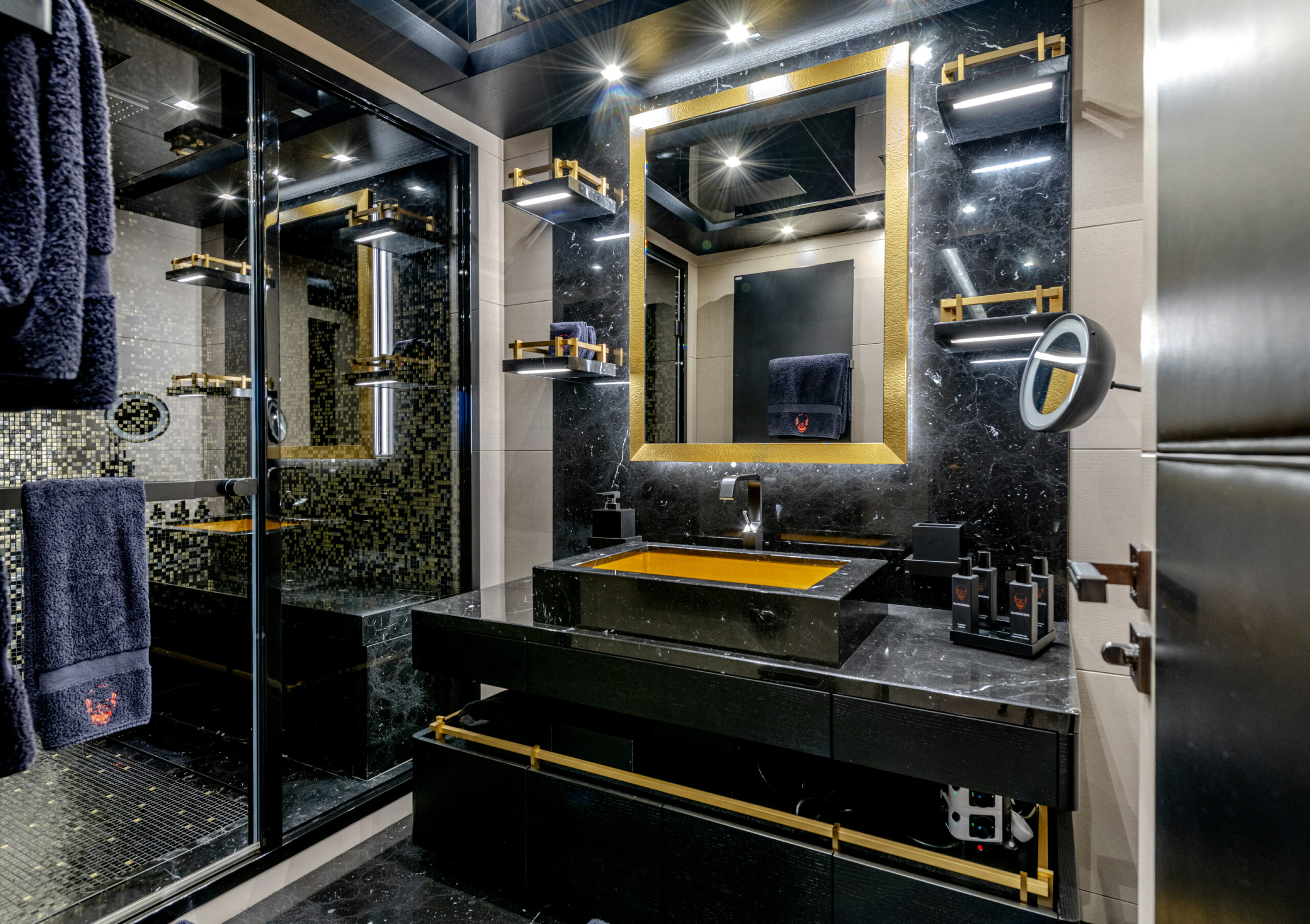 Her sleek black hull and striking exterior profile make BLACK LEGEND a head-turner in every marina. With 425m² of combined interior and exterior guest areas, designed with meticulous attention to detail, the interiors feature a sophisticated blend of light and dark wood, marble finishes, and luxurious touches from renowned designers such as Minotti and Versace.