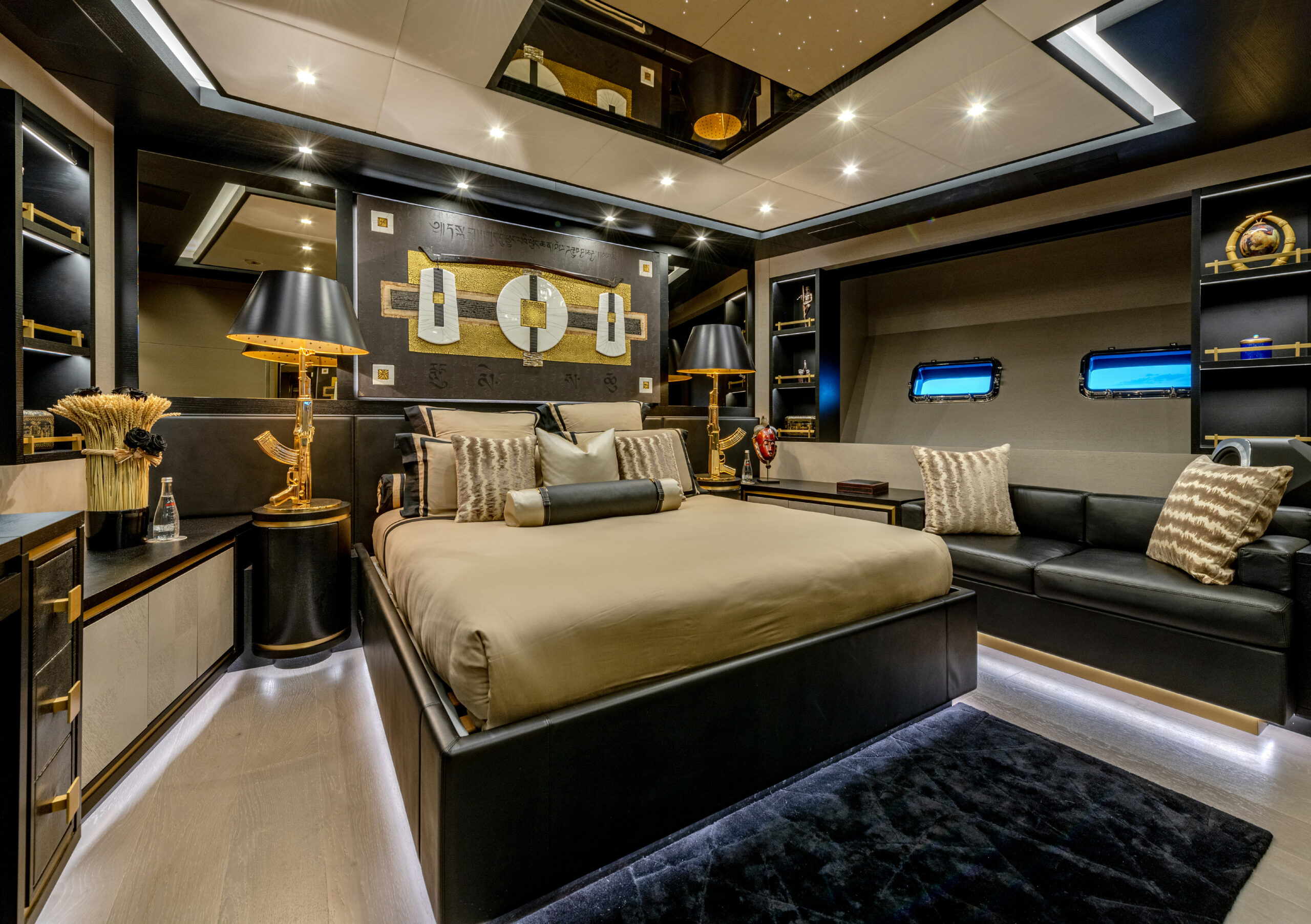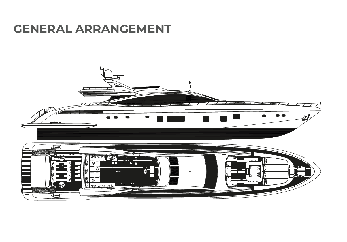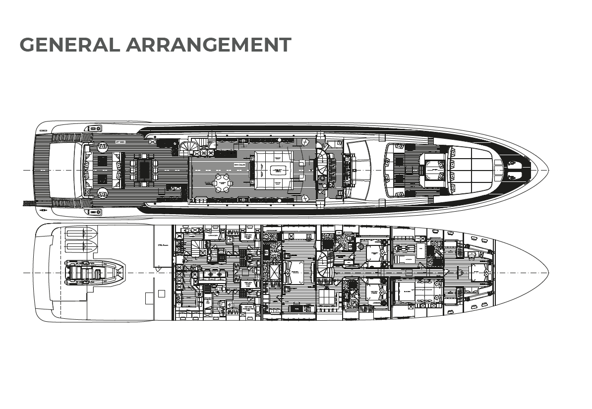 A true powerhouse on the water, BLACK LEGEND is equipped with four MTU 2600 HP engines, delivering a blistering top speed of 35 knots and an economical cruising speed of 12 knots with two engines online. With a range of 800 nautical miles at cruising speed, she is equally suited for exhilarating speed and long-distance cruising. The yacht’s advanced engineering includes zero-speed and underway gyro stabilizers for unparalleled comfort.