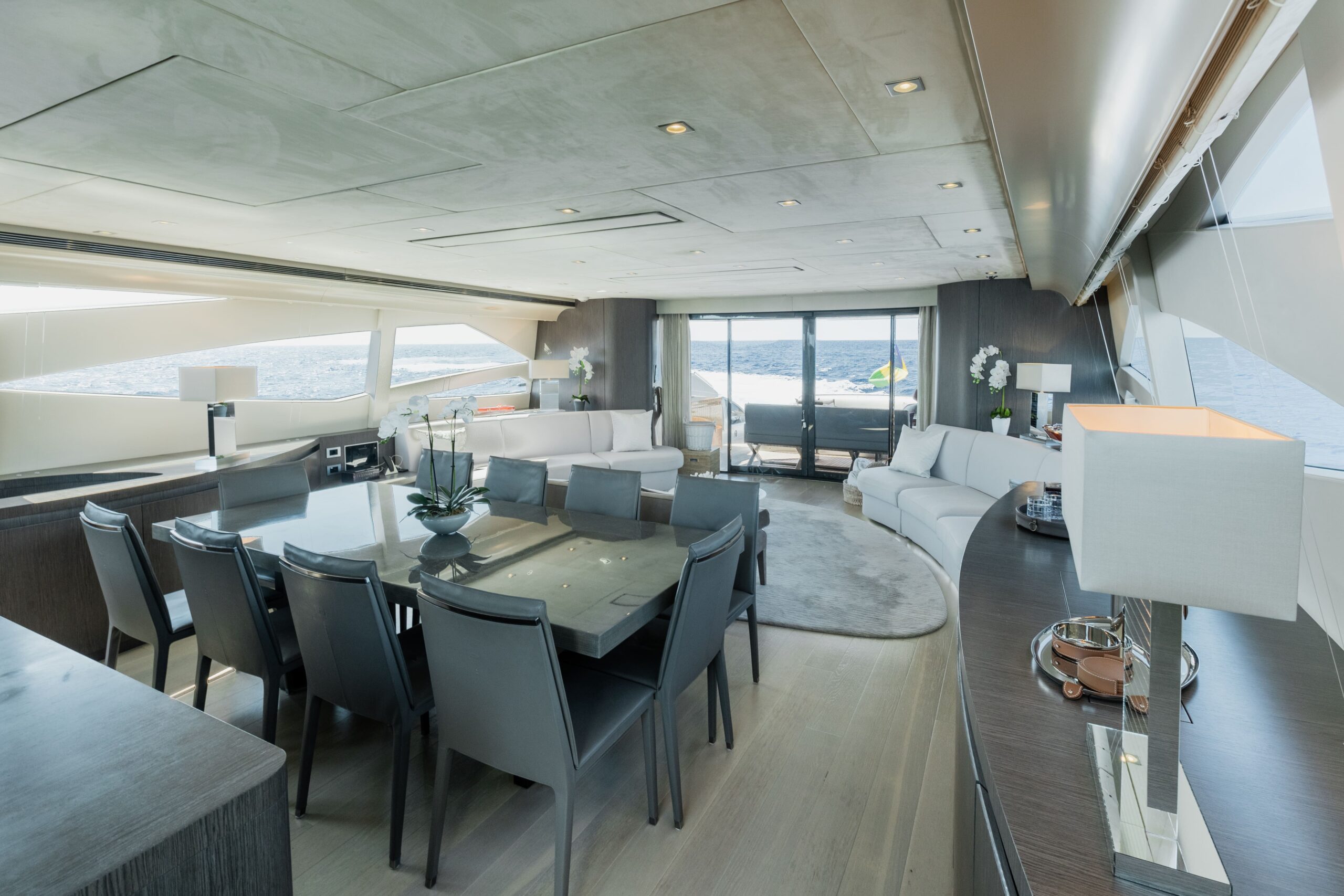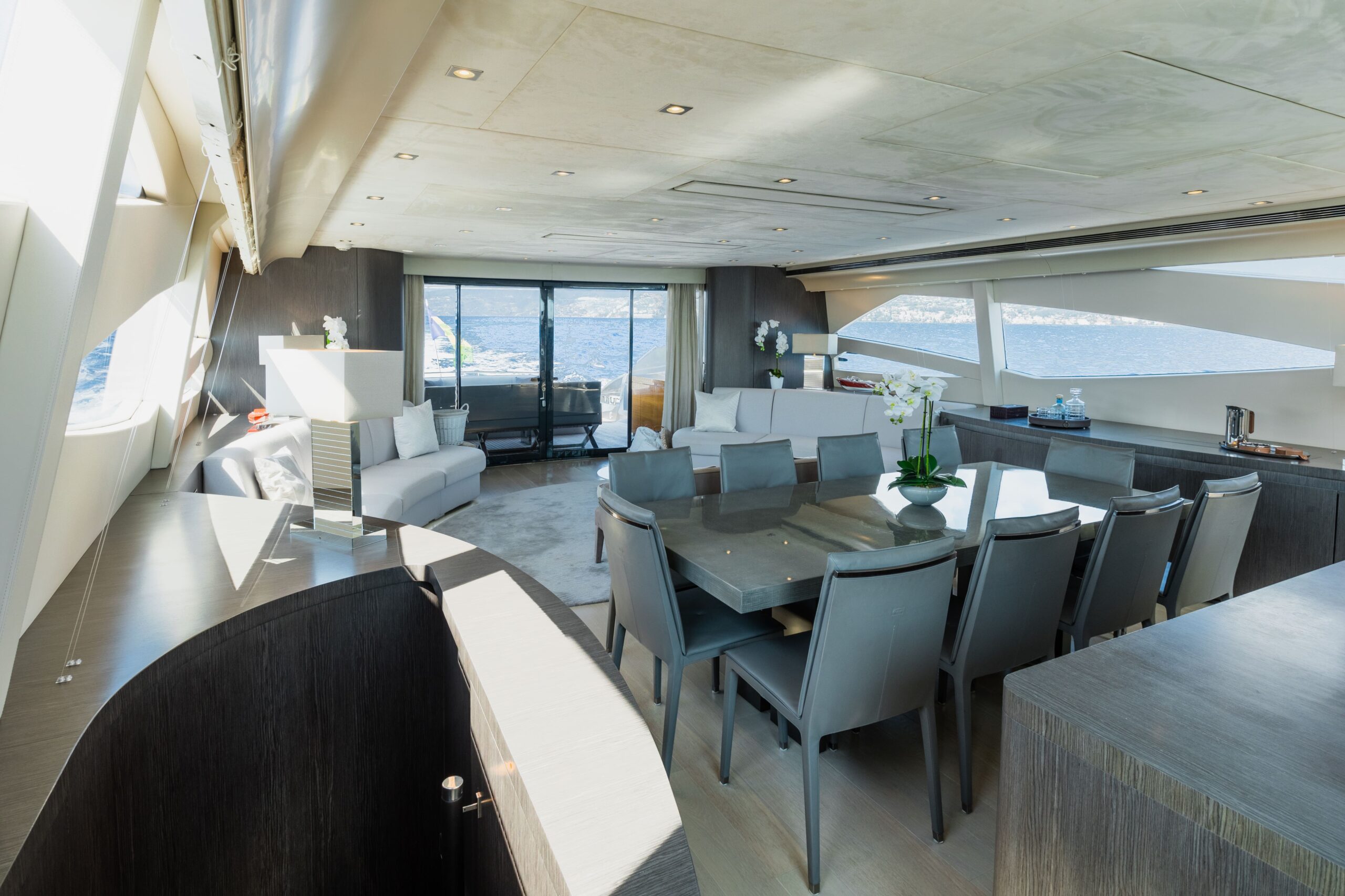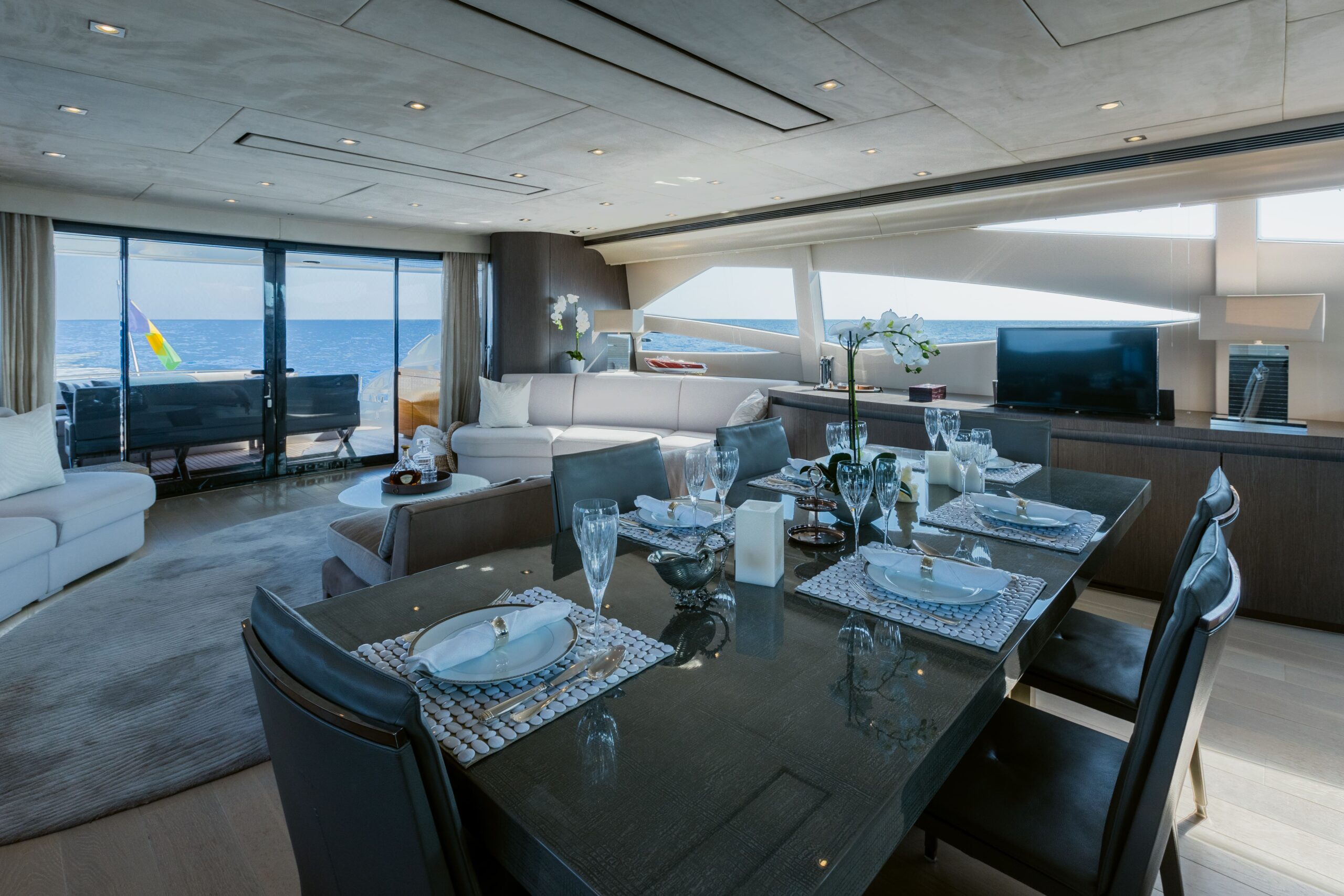 - Stylish main deck aft in direct connection with main deck lounge, fold down TV’s, wetbar and direct access to swimplatform