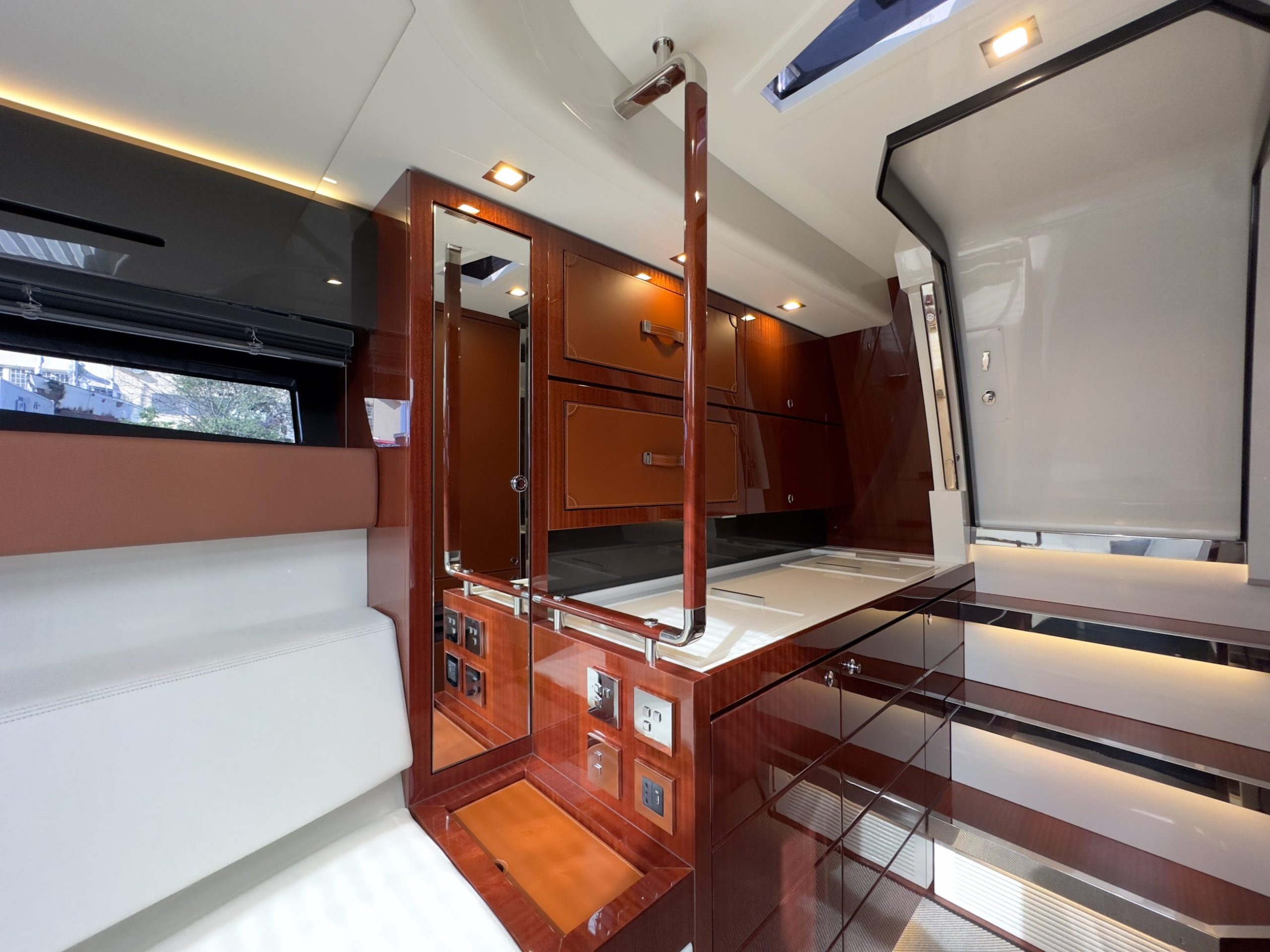 Below deck, the atmosphere is warm and refined, with rich wood finishes, leather upholstery and elegant detailing throughout. The spacious dinette converts into a double berth, while the galley and bathroom are thoughtfully equipped for comfort during longer days or short stays on board.