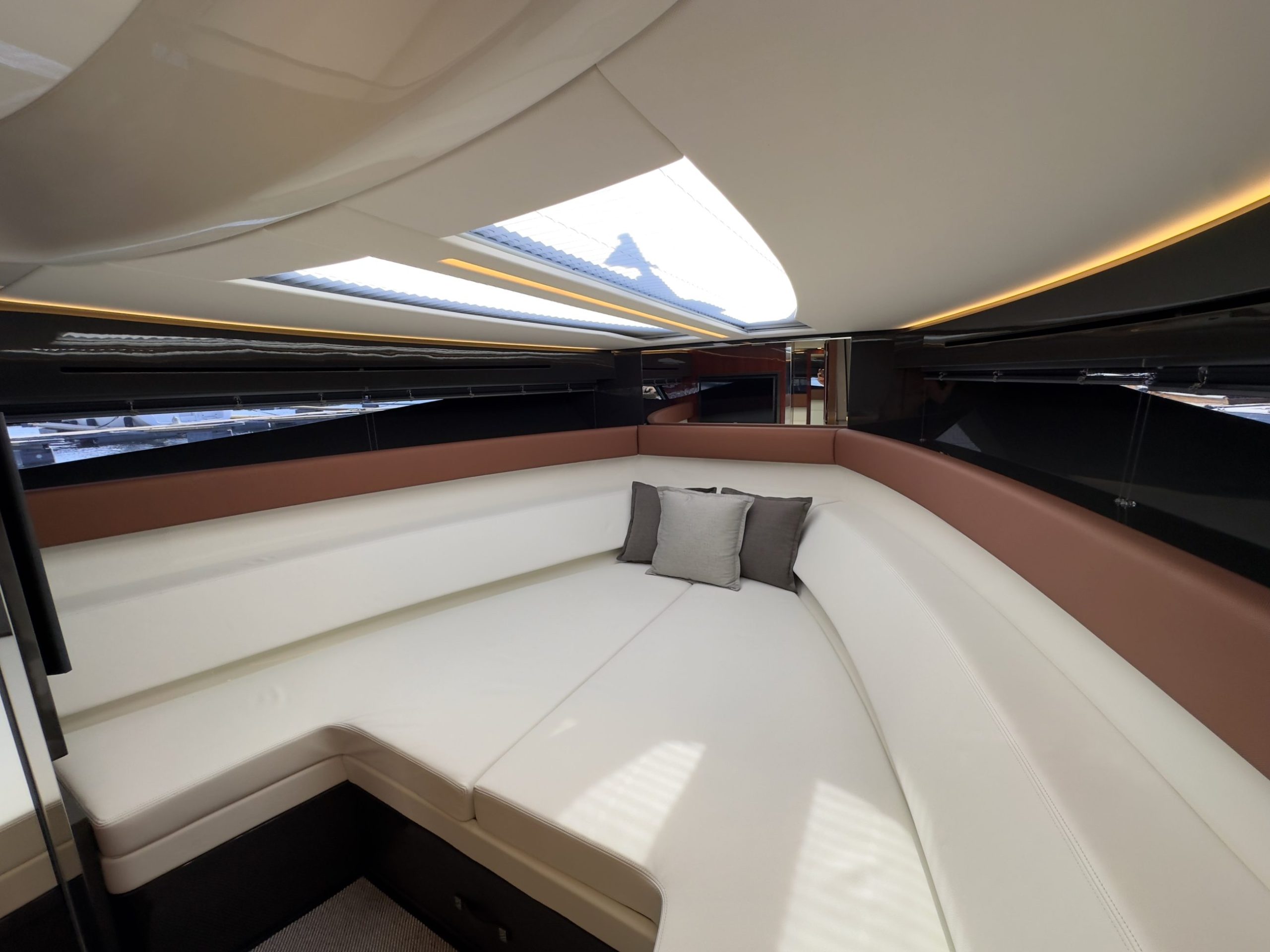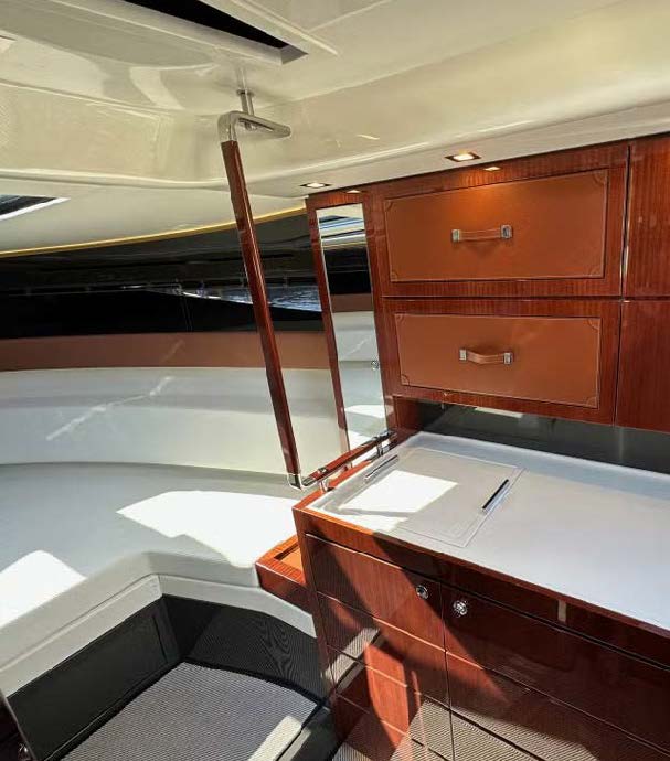 Below deck, this Riva 38 Rivamare for sale delivers an elegant yet highly practical interior that enhances onboard living. Rich wood finishes, leather upholstery and refined joinery create a warm and luxurious cabin environment, while the large dinette area with convertible seating demonstrates clever use of space, easily transforming into a double berth for overnight stays.