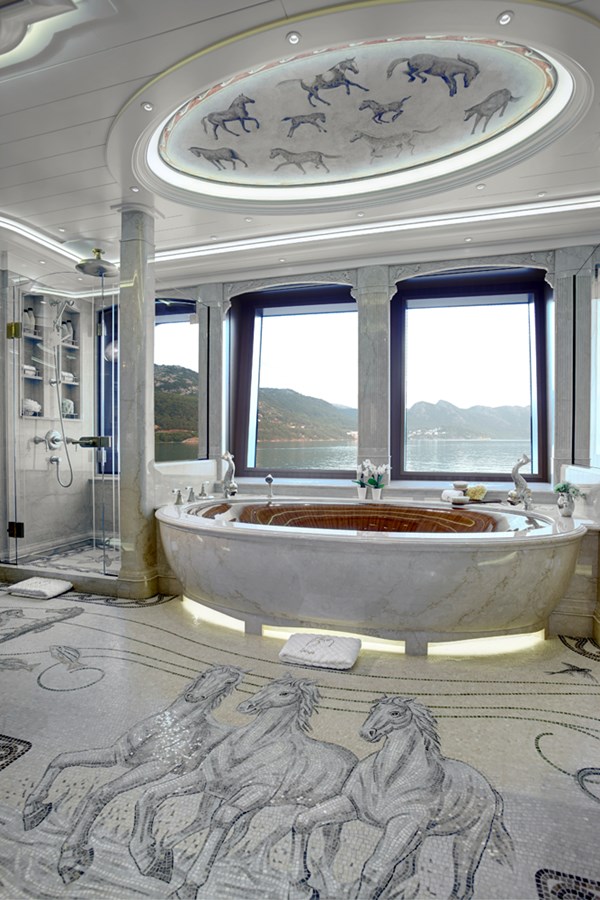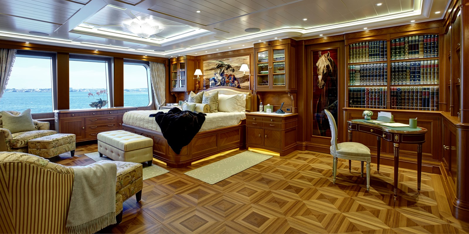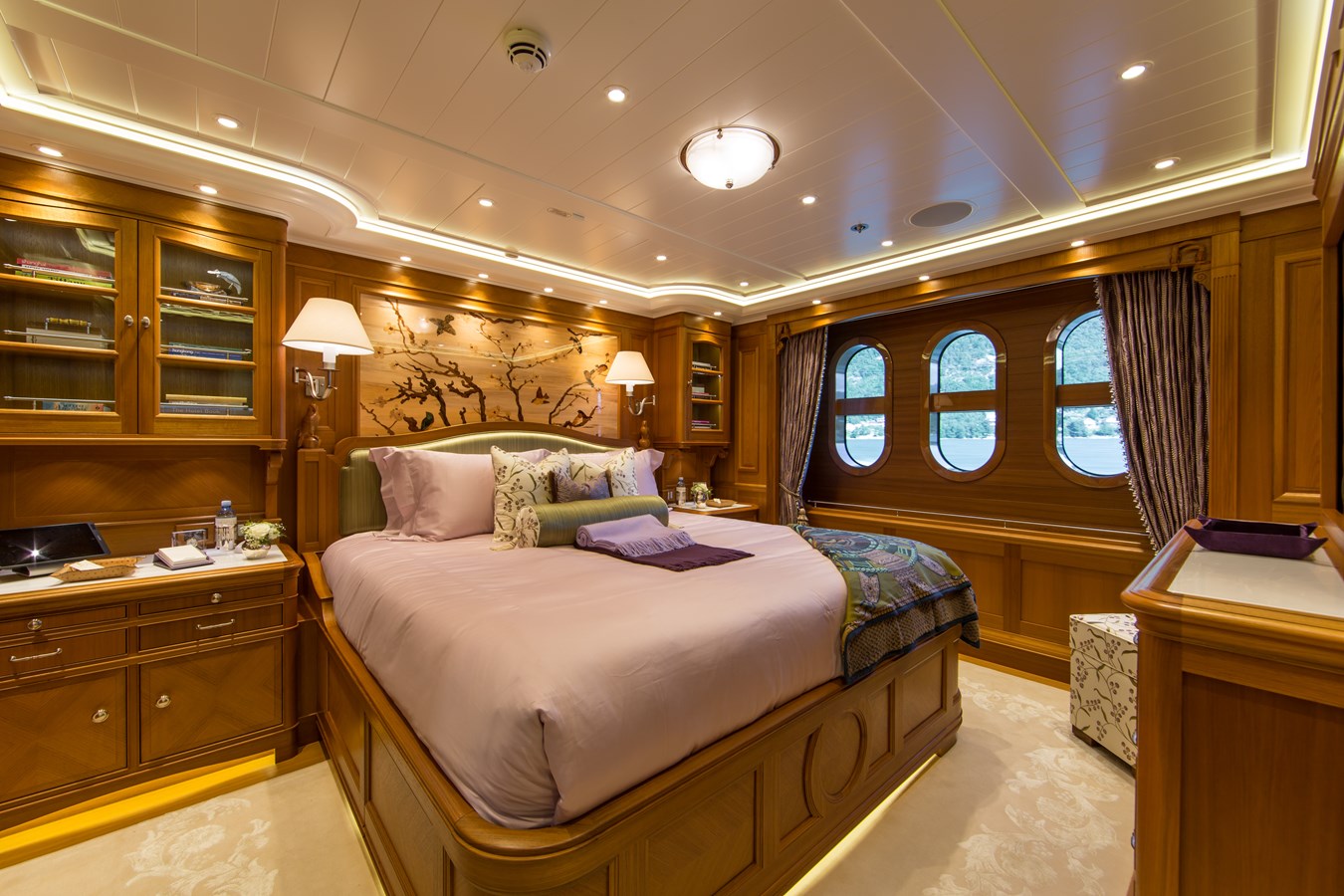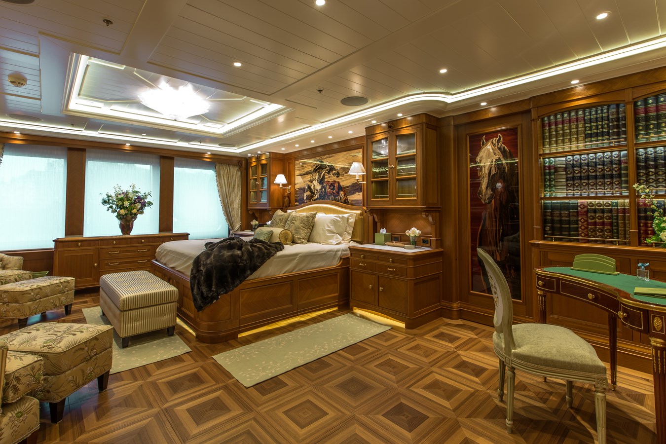 The superyacht offers several staterooms, each designed with meticulous attention to detail, providing a comfortable and luxurious retreat for guests. The master suite is particularly noteworthy, offering unrivaled opulence and privacy, complete with a private study, walk-in wardrobes, and an en-suite bathroom.