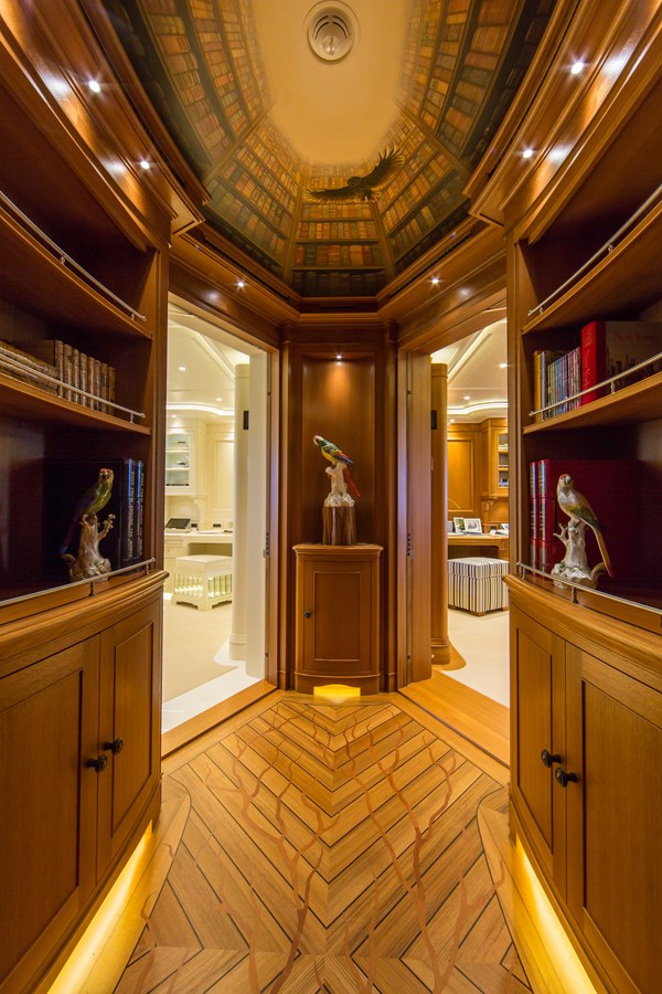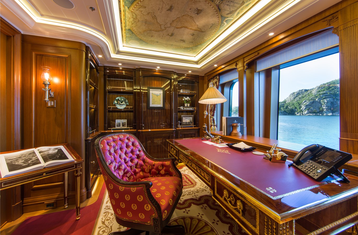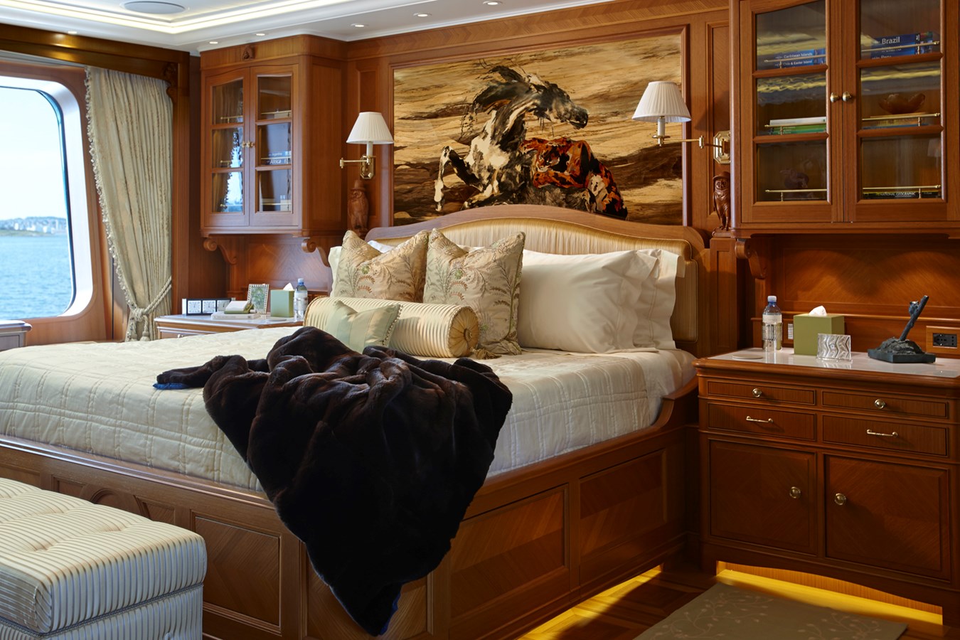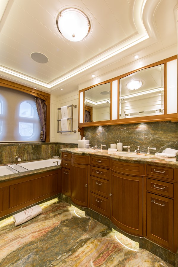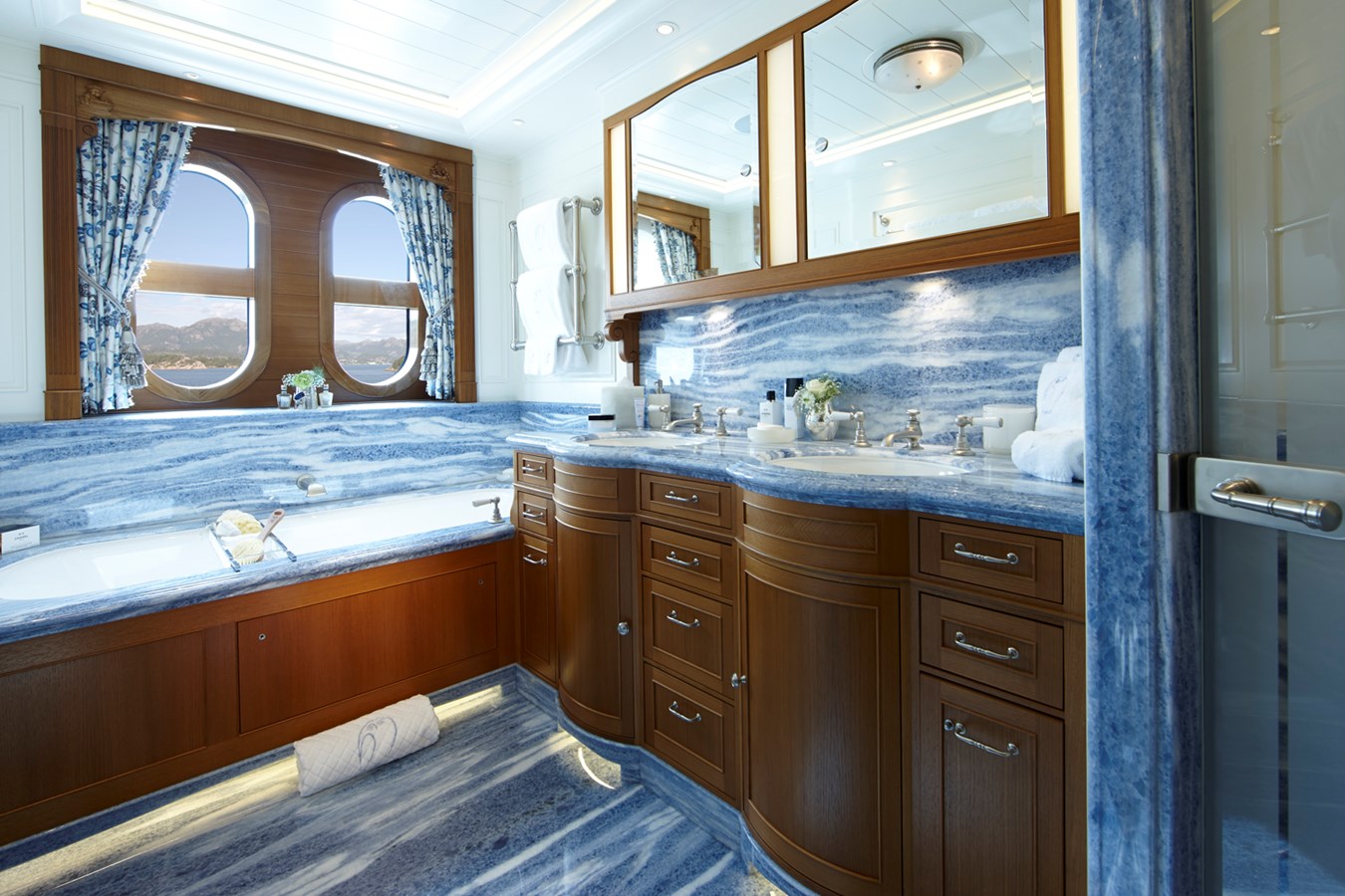 The superyacht offers several staterooms, each designed with meticulous attention to detail, providing a comfortable and luxurious retreat for guests. The master suite is particularly noteworthy, offering unrivaled opulence and privacy, complete with a private study, walk-in wardrobes, and an en-suite bathroom.