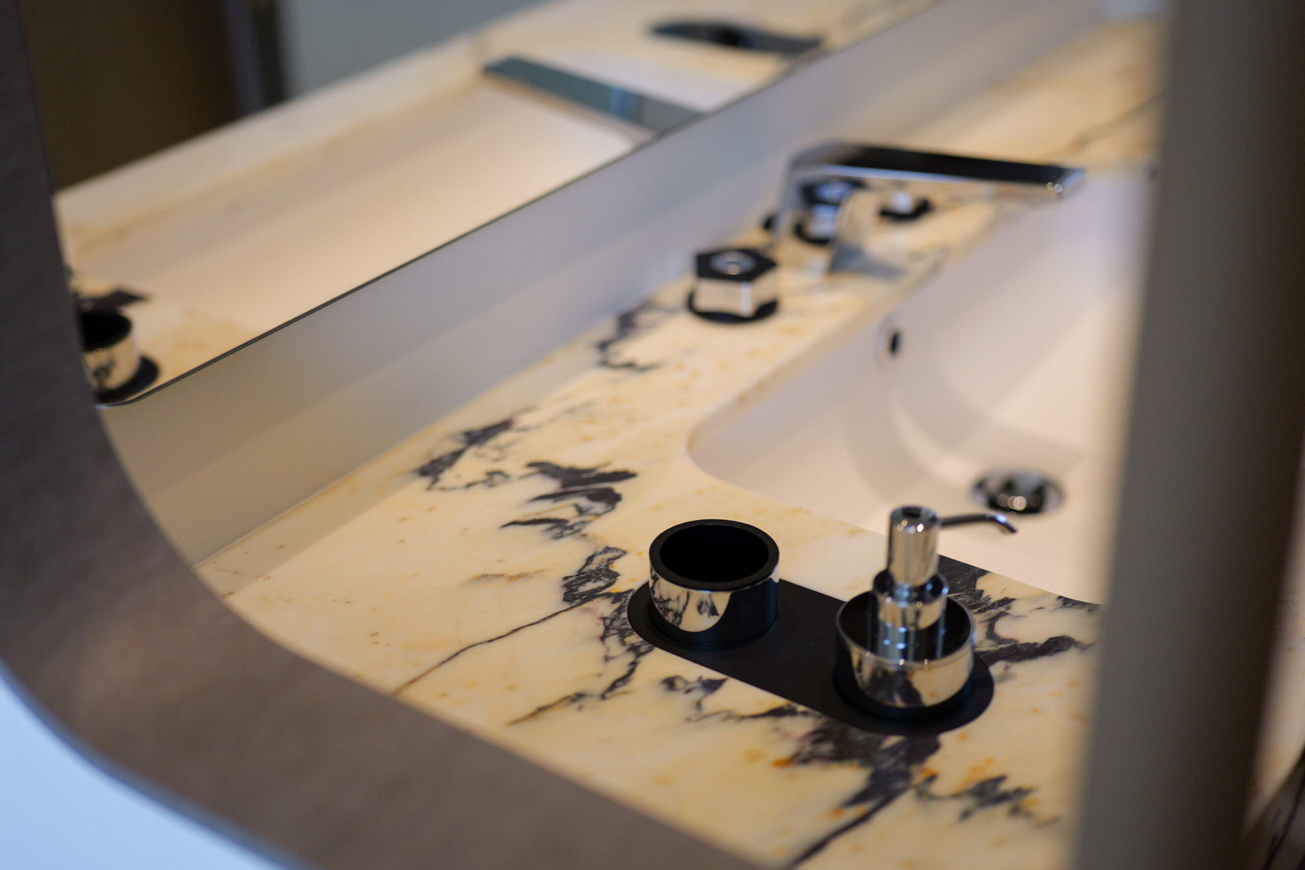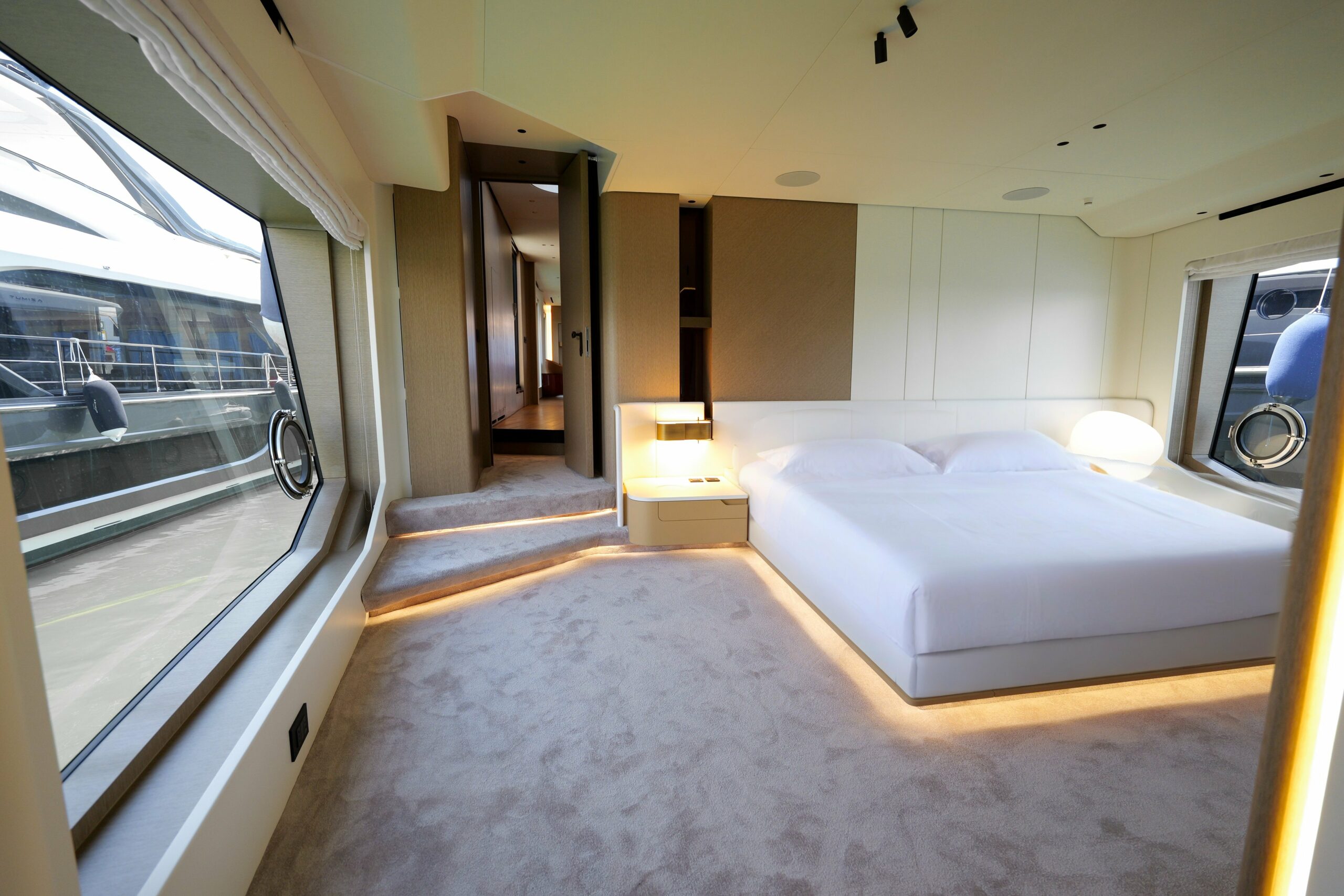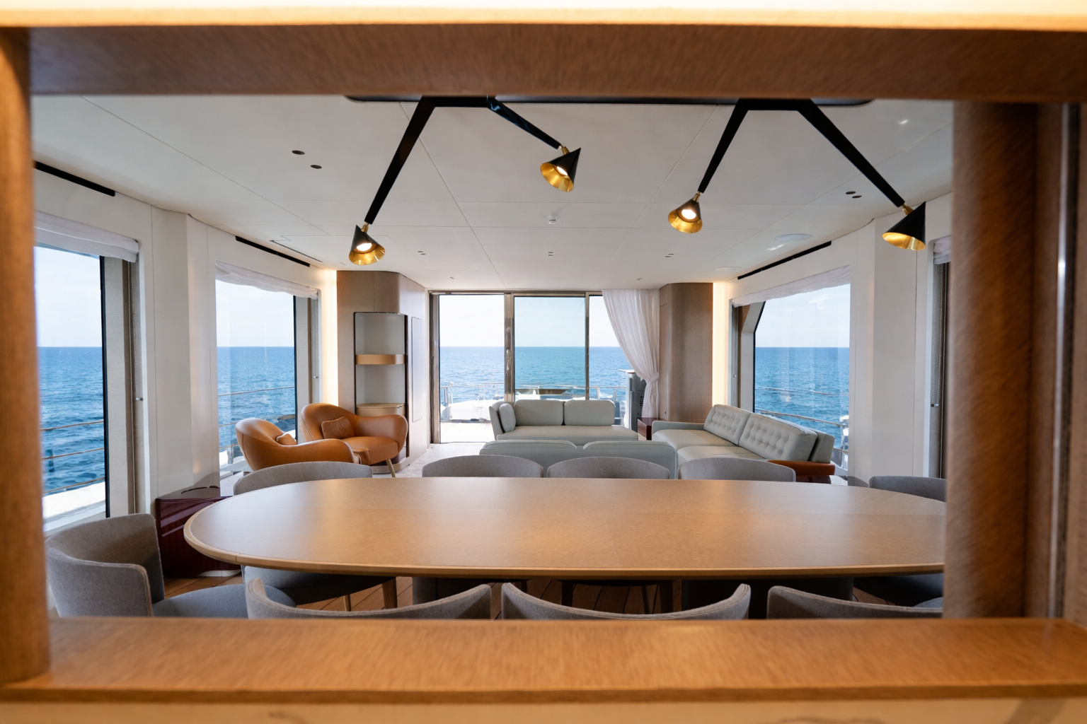 The interior design, penned by Achille Salvagni, is refined and contemporary, defined by a soft, neutral palette and premium material selections including Paonazzetto marble and Statuario quartzite surfaces. Floor-to-ceiling windows on the main deck flood the interior with natural light, enhancing the sense of space and connection to the sea while creating an elegant yet welcoming onboard atmosphere.