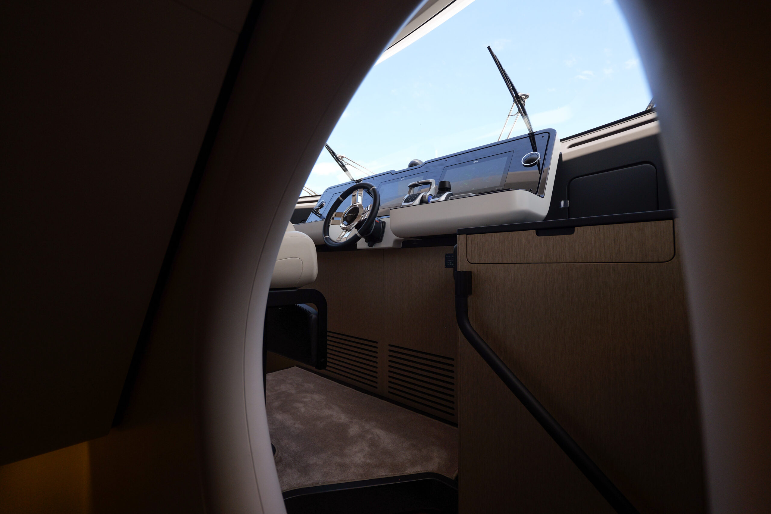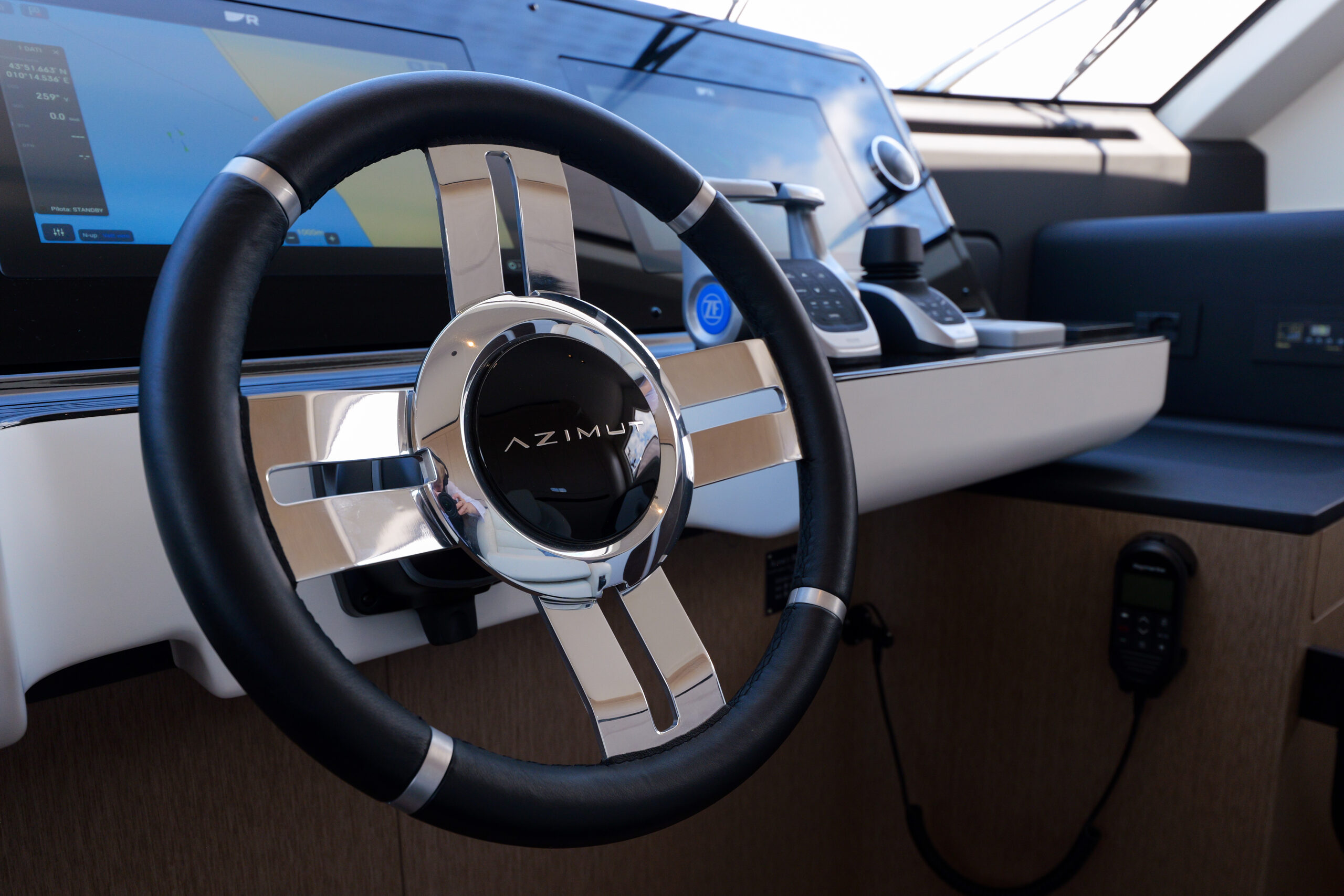 Azimut’s signature Deck2Deck™ system creates a seamless connection between cockpit and swim platform, enhancing social flow and water access. The hydraulic platform, tender garage with Williams 395 Jet Tender, and expansive flybridge with retractable hardtop create a versatile lifestyle layout.