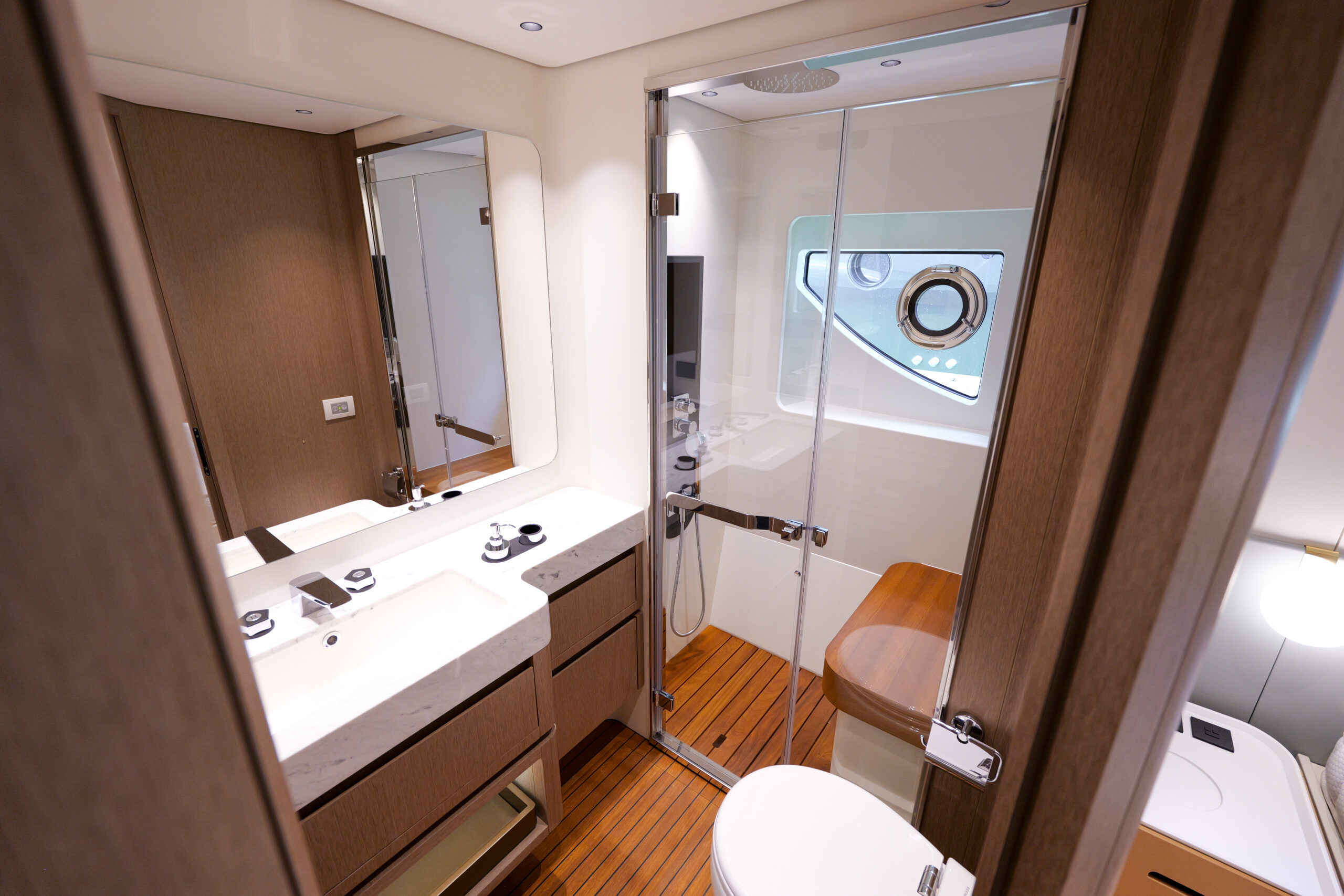 Accommodation is arranged for up to 10 guests in five cabins, including a full-beam master suite on the main deck, a feature typically found on larger yachts. Four additional double cabins on the lower deck are all en suite, ensuring privacy and comfort.