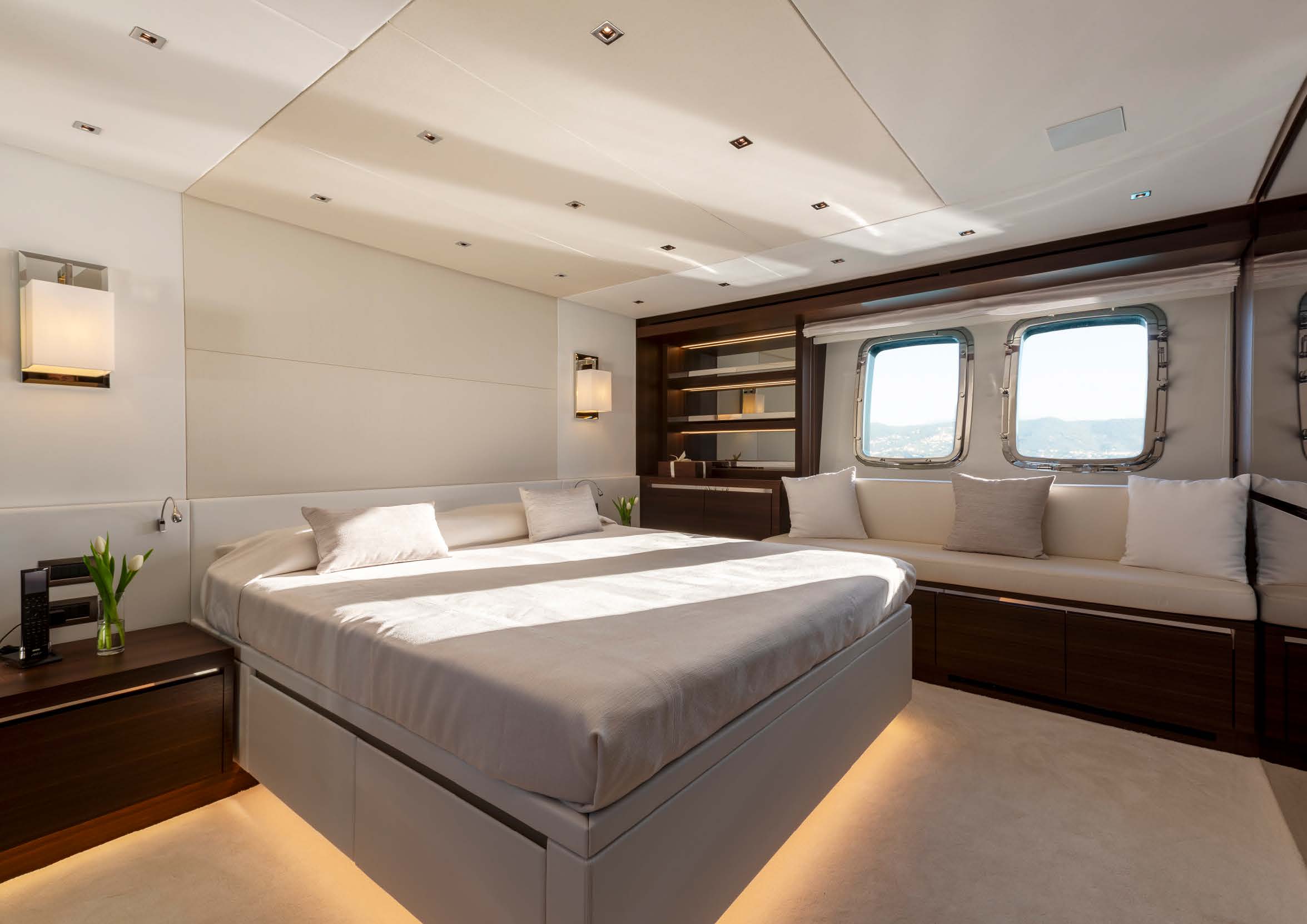 Conditions inside are understated deluxe: woods, fabrics, and carpentry. Light colours throughout keep the feel airy and modern. The supertropical air conditioning system is fully prepared to tackle sticky heat. Clean lines and a range of lighting options tie together the interior design into one of modernity and sophistication.
