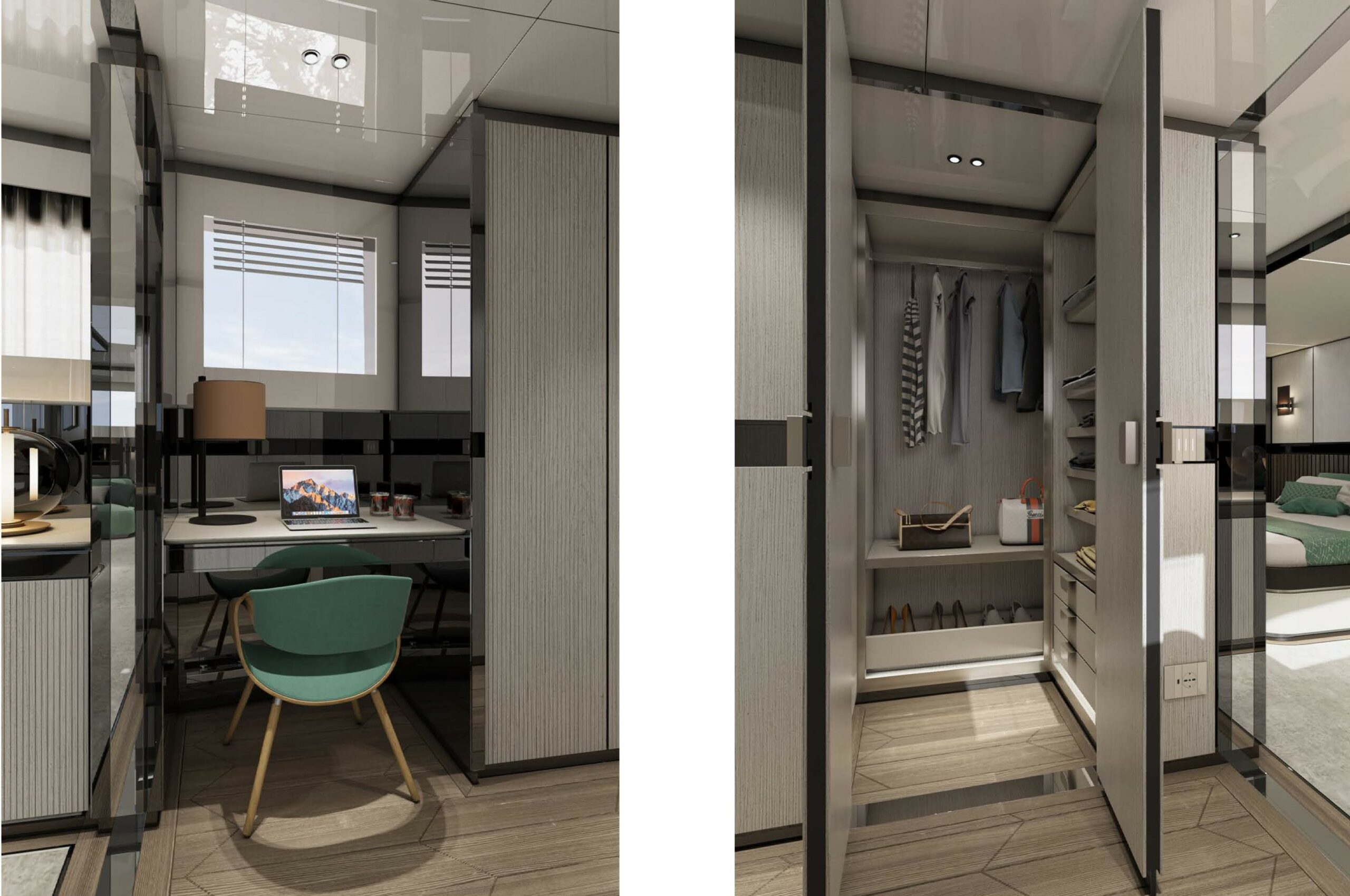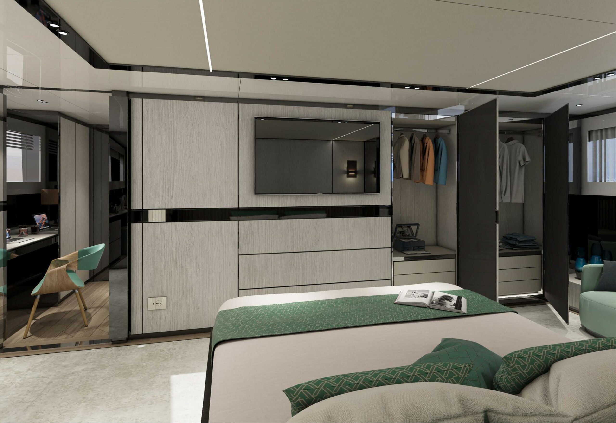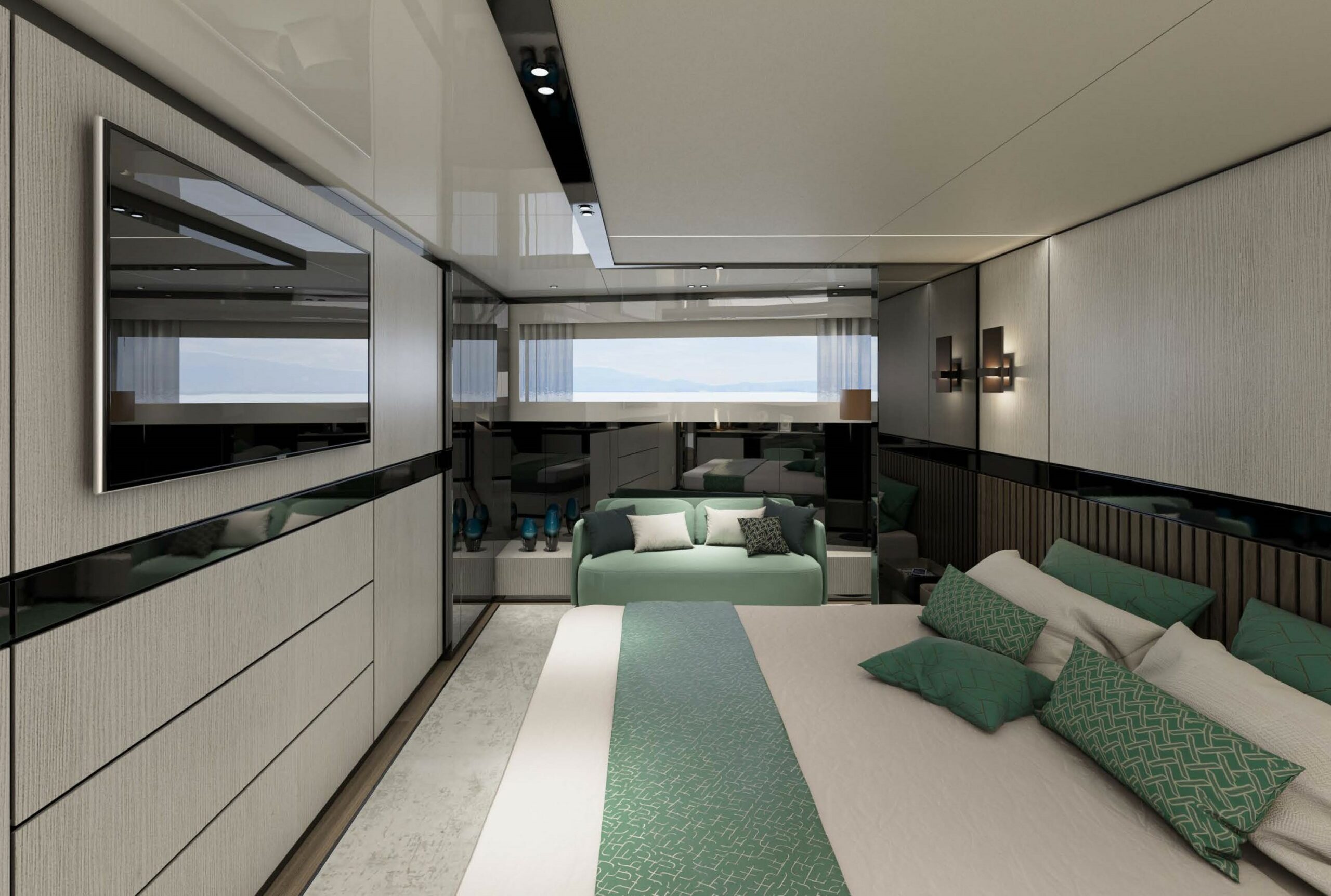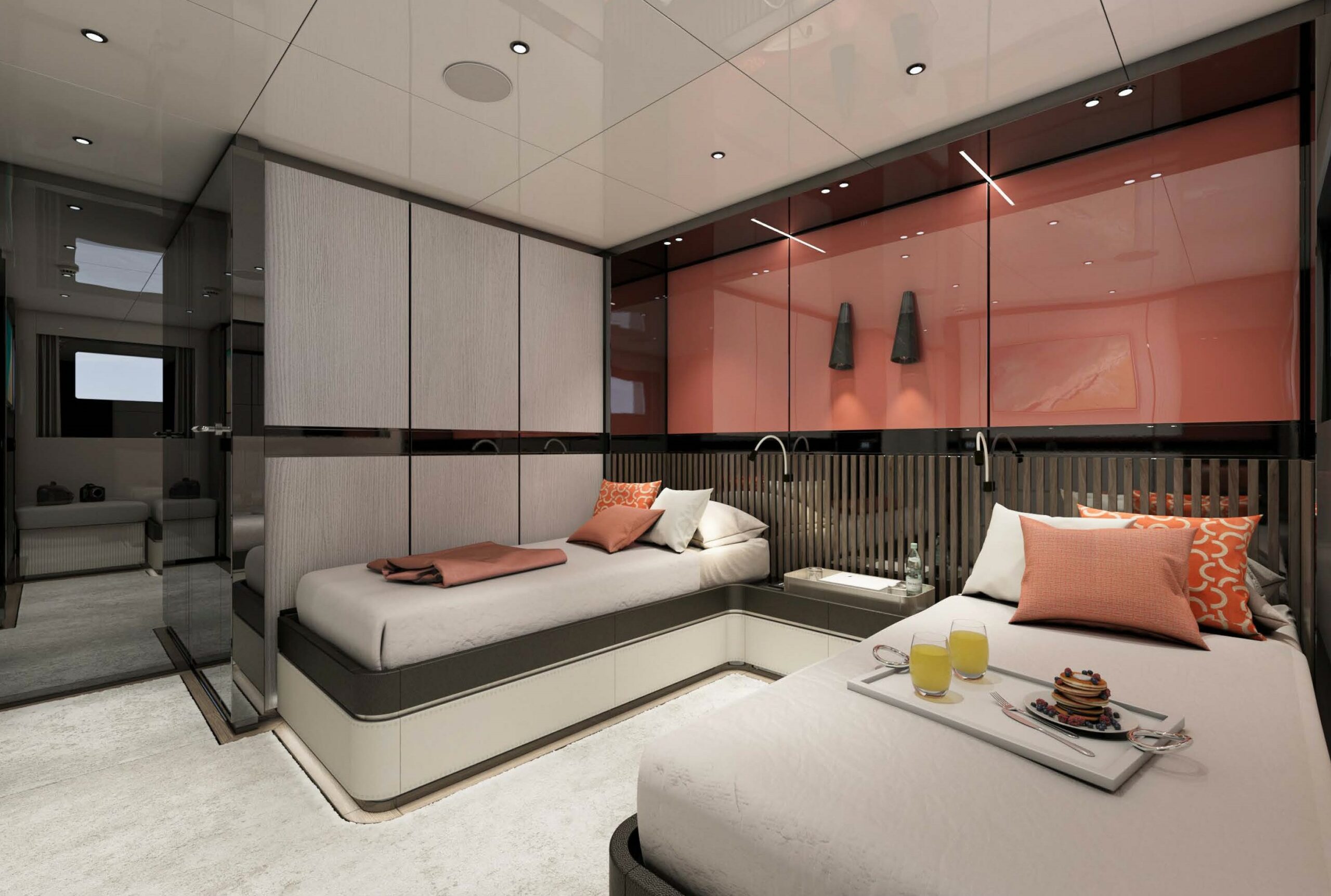 Situated on the Main deck, the Master cabin offers an elegant sanctuary, complete with a private study, a spacious walk-in wardrobe, and the indulgence of separate his and her bathrooms. Thoughtfully designed to blend luxury and functionality, this sophisticated suite provides a tranquil escape, perfectly suited for relaxation and privacy.