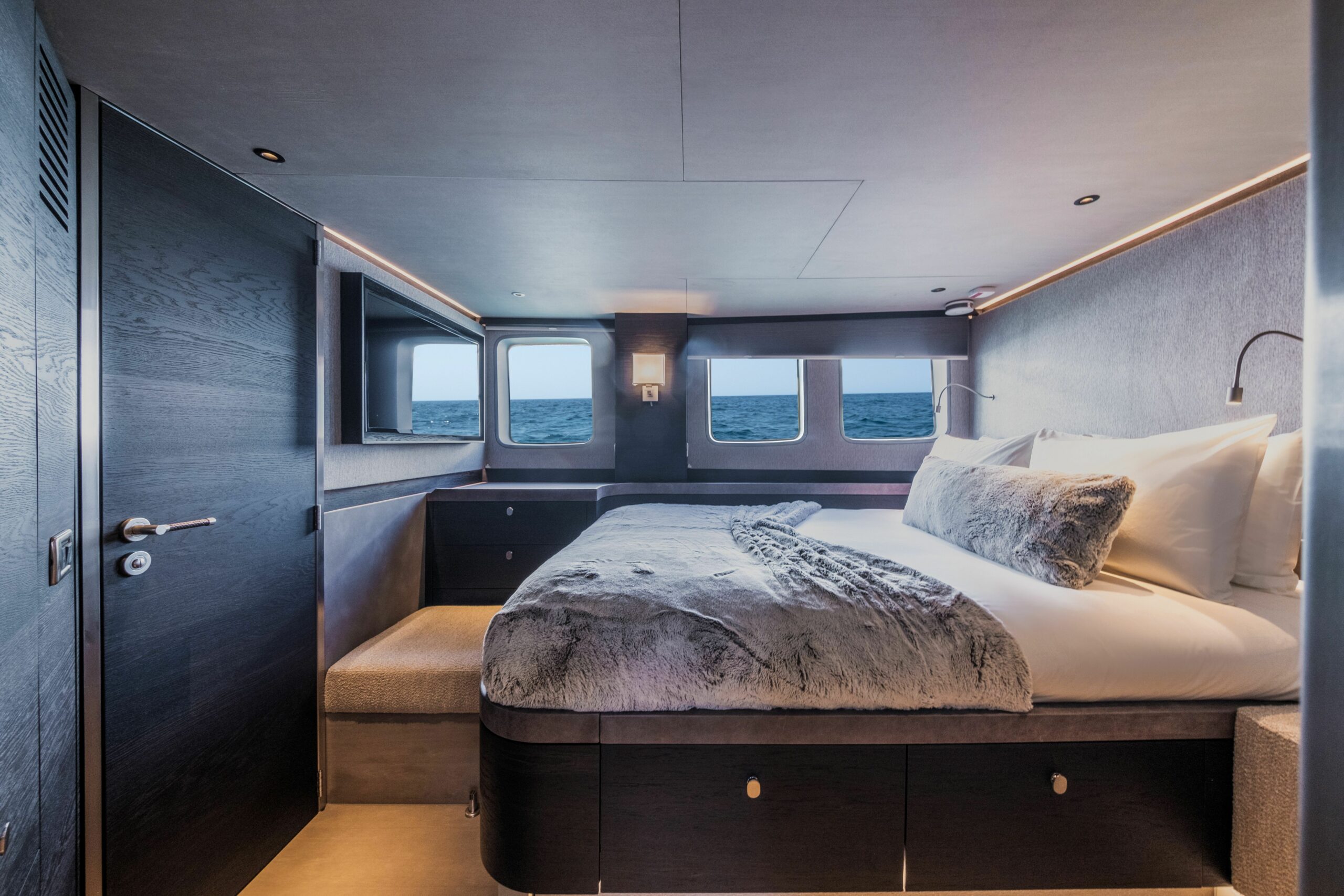 On the lower deck, LOLOMA’s accommodation includes a full‑beam owner’s suite with king‑size berth plus two guest cabins each with an en‑suite bathroom ensuring privacy and convenience for up to six guests. Her cleverly designed layout also includes a crew cabin and tender garage aft of the guest cabins.